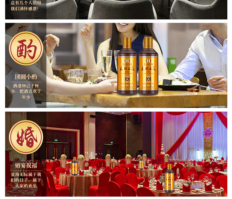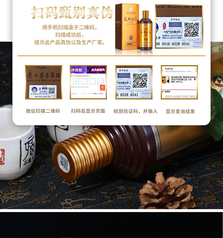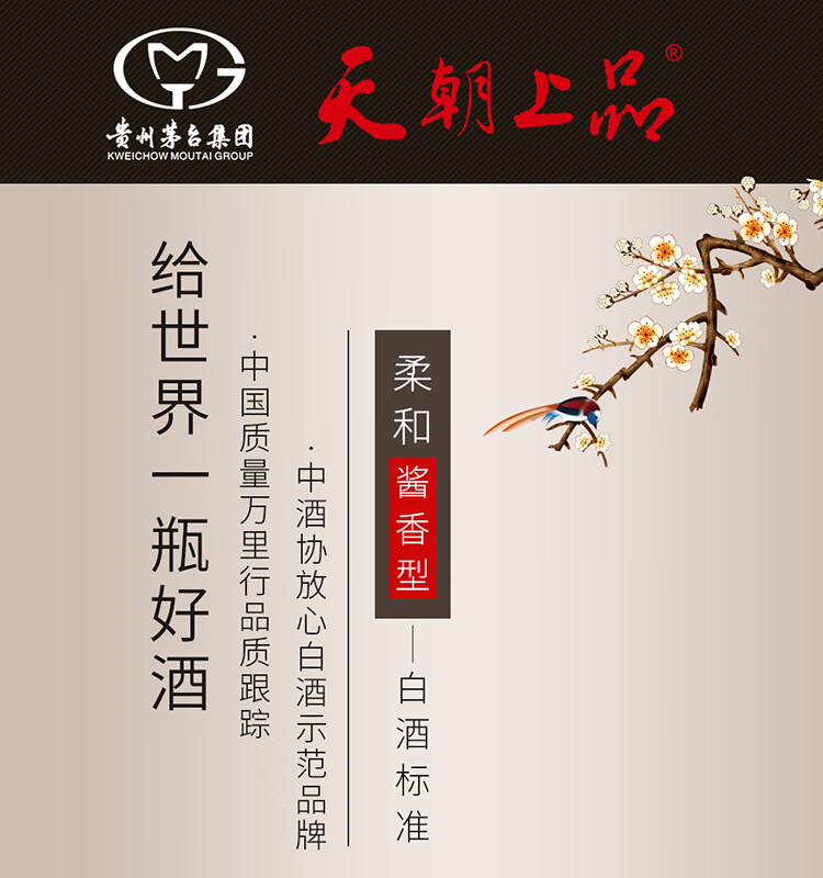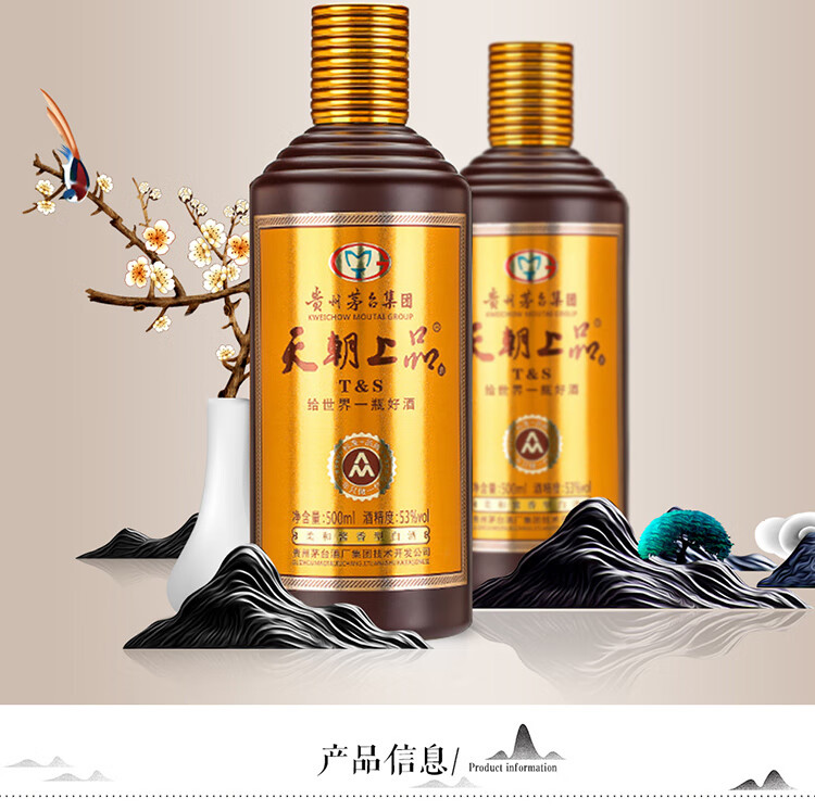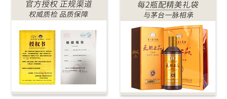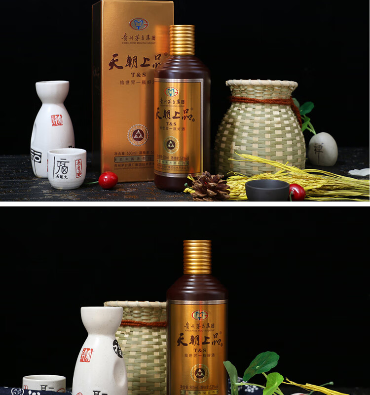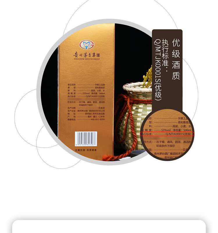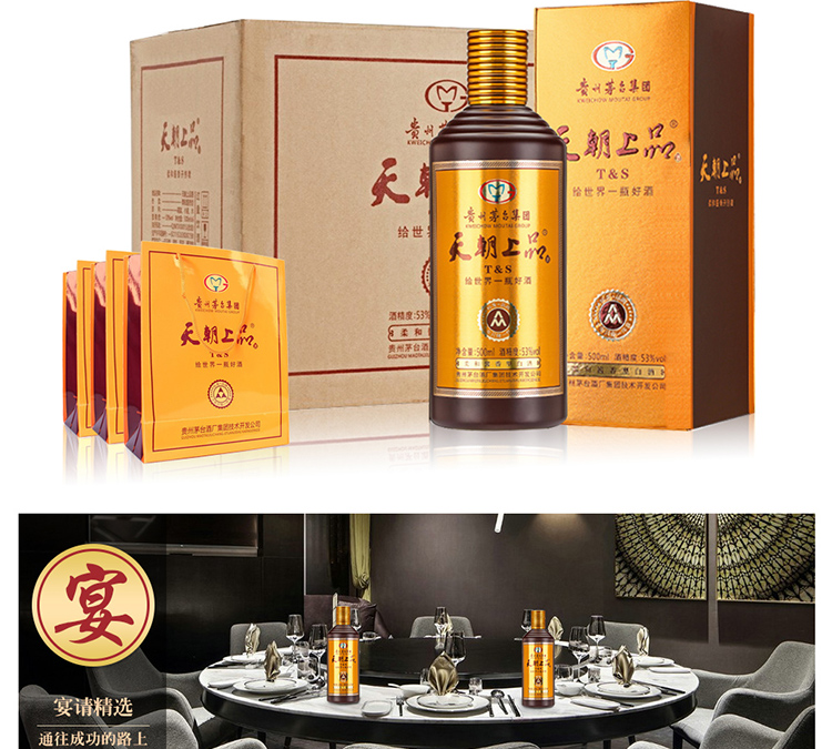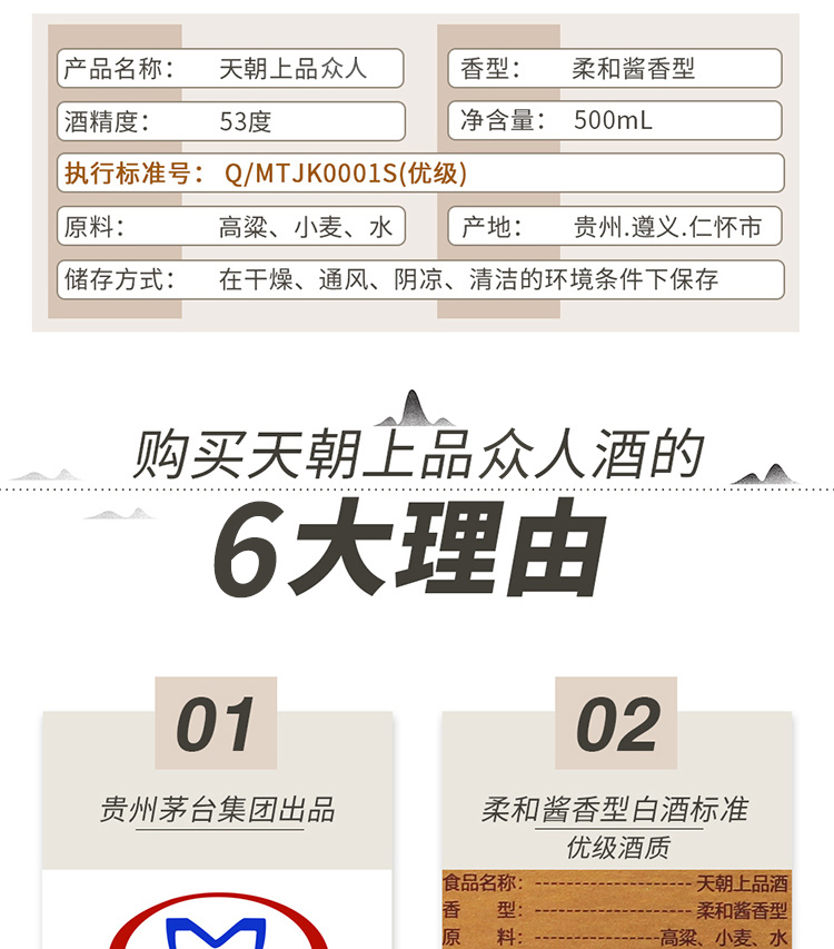 包装:整箱装;容量:500-749mL;香型:酱香型;产地:贵州;度数:50度及以上;酒精度:53%vol;容量:500ml;产品重量:1g;包装清单:茅台天朝上品众人酒53度500ml*6瓶整箱装 礼品袋*3;