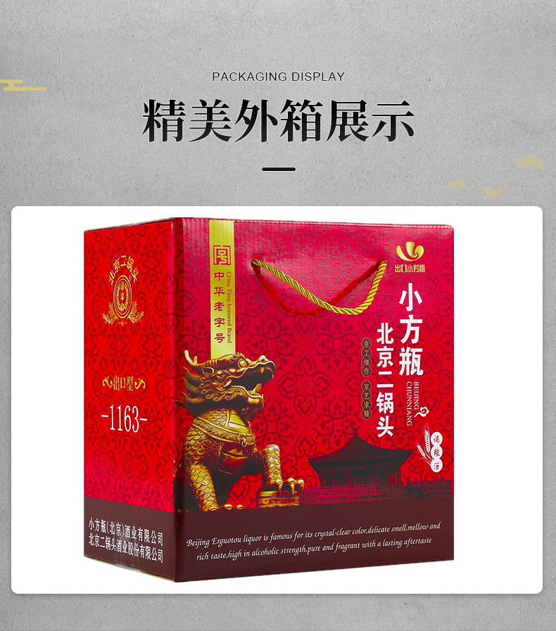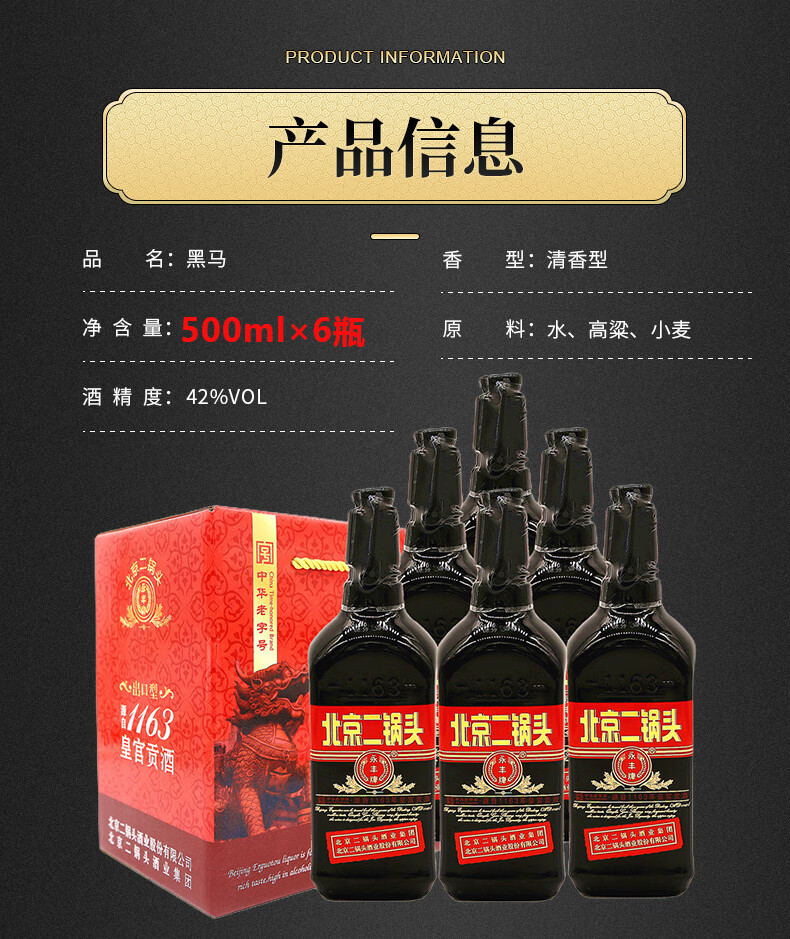 包装:整箱装;容量:500-749mL;香型:清香型;度数:40-49度;产地:北京;酒精度:42%vol;产品重量:500g;容量:500ml;包装清单:500ml*6;
