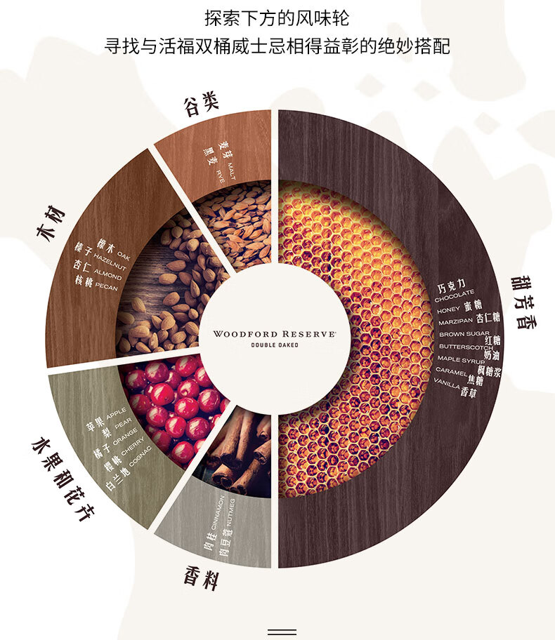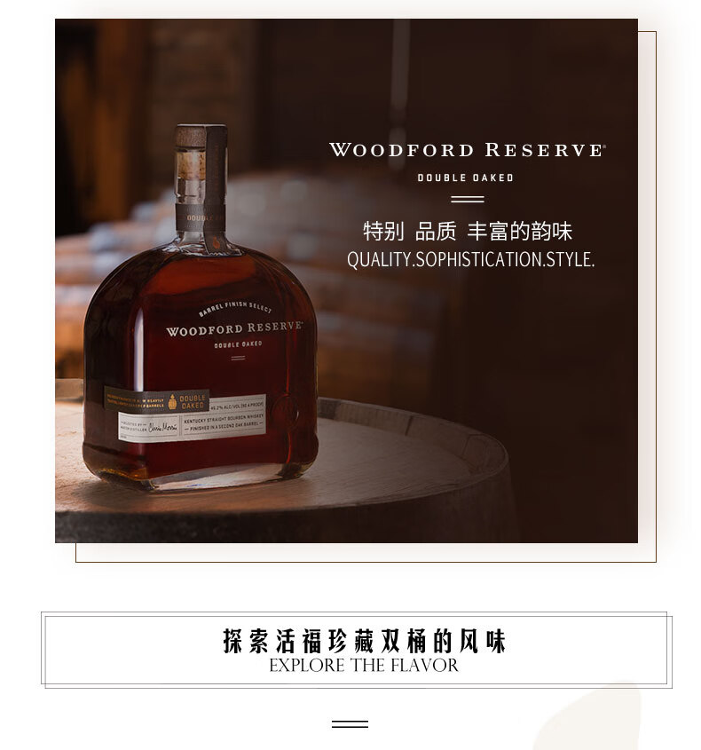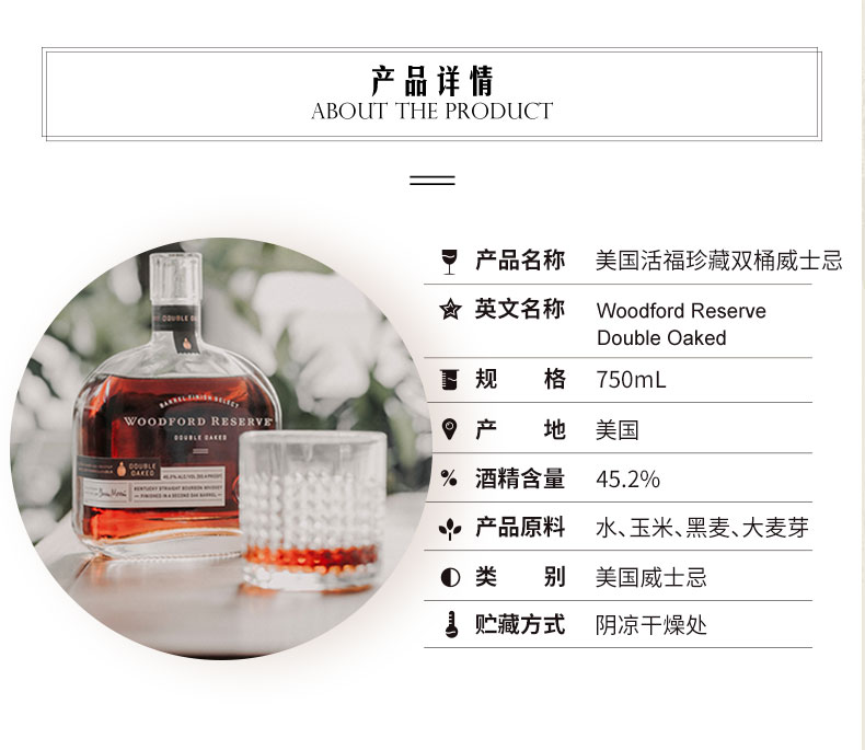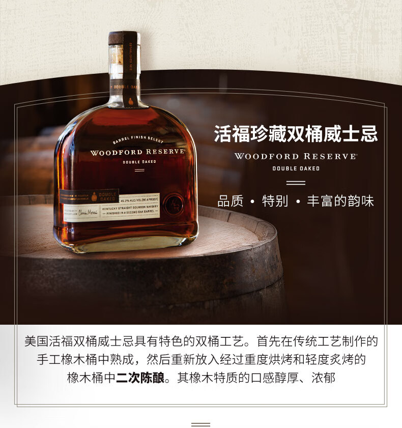 类型:波本威士忌;产地:美国;适用场景:情侣约会,闺蜜私语,自斟自饮,亲友馈赠,家庭聚会,商务宴请;包装:瓶装;容量:700-999mL;阶段:进阶优选;原料:水、玉米、黑麦、大麦芽;保质期:长期;酒精度:45.2%vol;存储方法:阴凉避光;产品重量:0.75kg;容量:750mL;包装清单:活福(Woodford)美国进口 珍藏双桶威士忌 活福双桶 750ml*1;