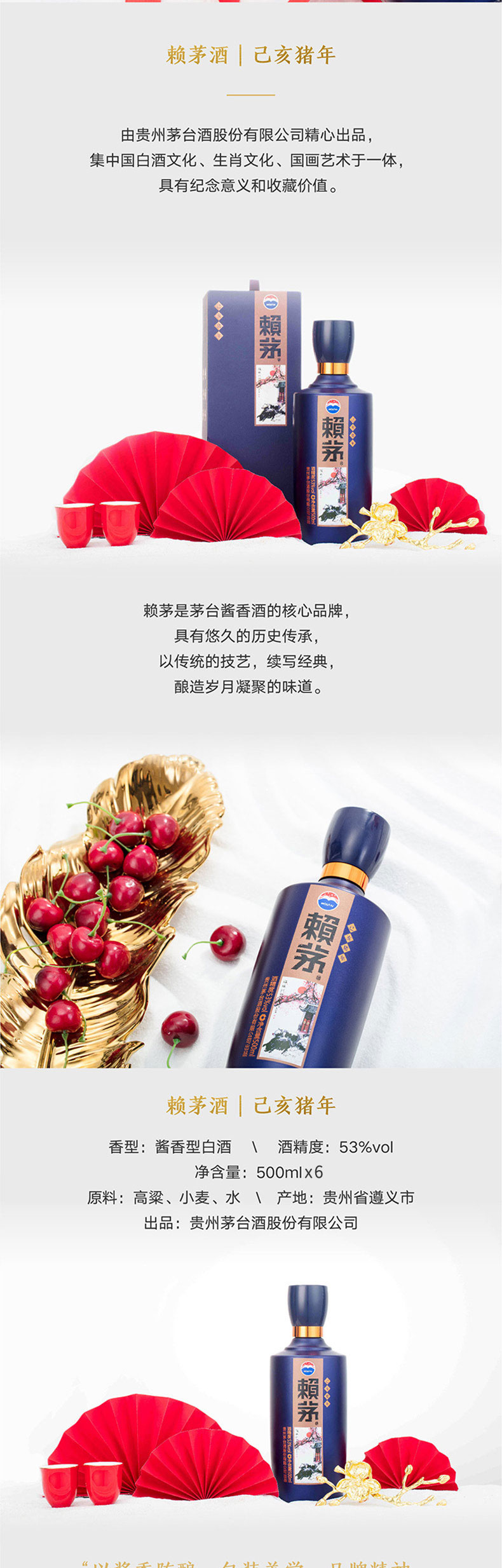包装:整箱装;容量:376-499mL;香型:酱香型;度数:50度及以上;产地:贵州;酒精度:53%vol;产品重量:0g;容量:500;包装清单:茅台 赖茅 己亥猪年生肖纪念酒 53度500ml*6 整箱装 酱香型白酒*1;