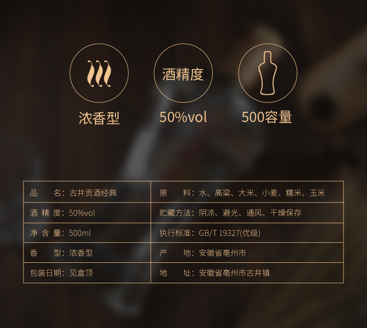 包装:整箱装;容量:376-499mL;香型:浓香型;产地:其它;度数:50度及以上;酒精度:50%vol;容量:500ml;产品重量:8.07g;包装清单:古井贡酒 经典古井贡 50度整箱装白酒500ml*6瓶 口感浓香型;