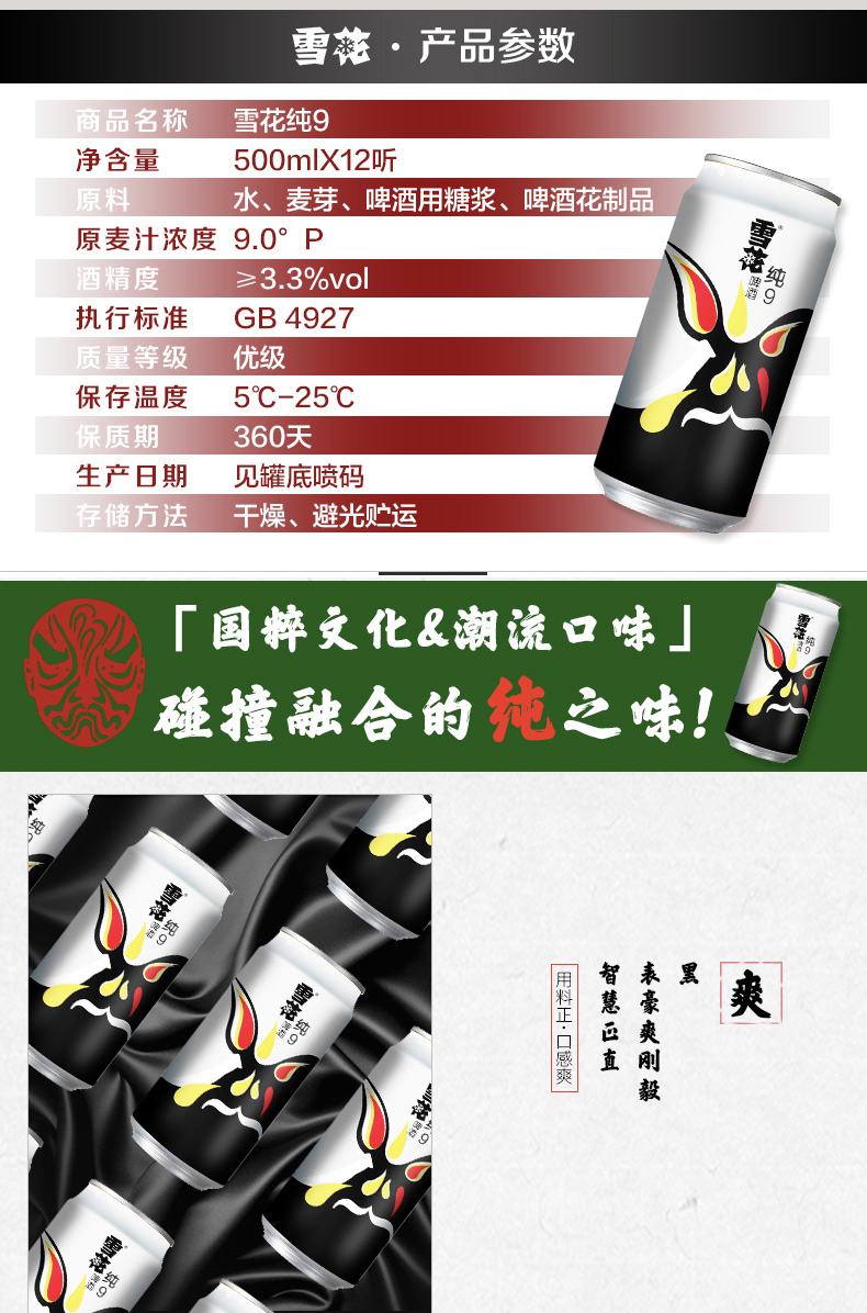国产/进口:国产;产地:中国大陆;适用场景:家庭聚会,礼节拜访,自斟自饮,派对必备,烧烤撸串,酒吧夜店,野餐出游;包装:听装;容量:500mL;类别:黄啤酒;容量:500ml;产品重量(kg):6.5;包装:听装;存储方法:5℃-25℃ 干燥避光贮运;原料:水、麦芽、啤酒用糖浆、啤酒花制品;原麦汁浓度:9.0°P;酒精度:≥3.3%vol;国产/进口:国产;保质期:360天;原产地:中国;类别:黄啤酒;包装清单:雪花啤酒(Snowbeer) 纯9(冰酷升级版新规格) 500ml*12听 整箱装;