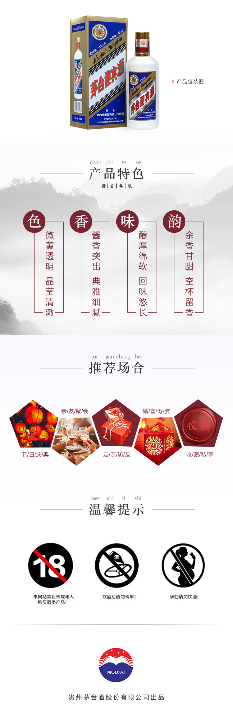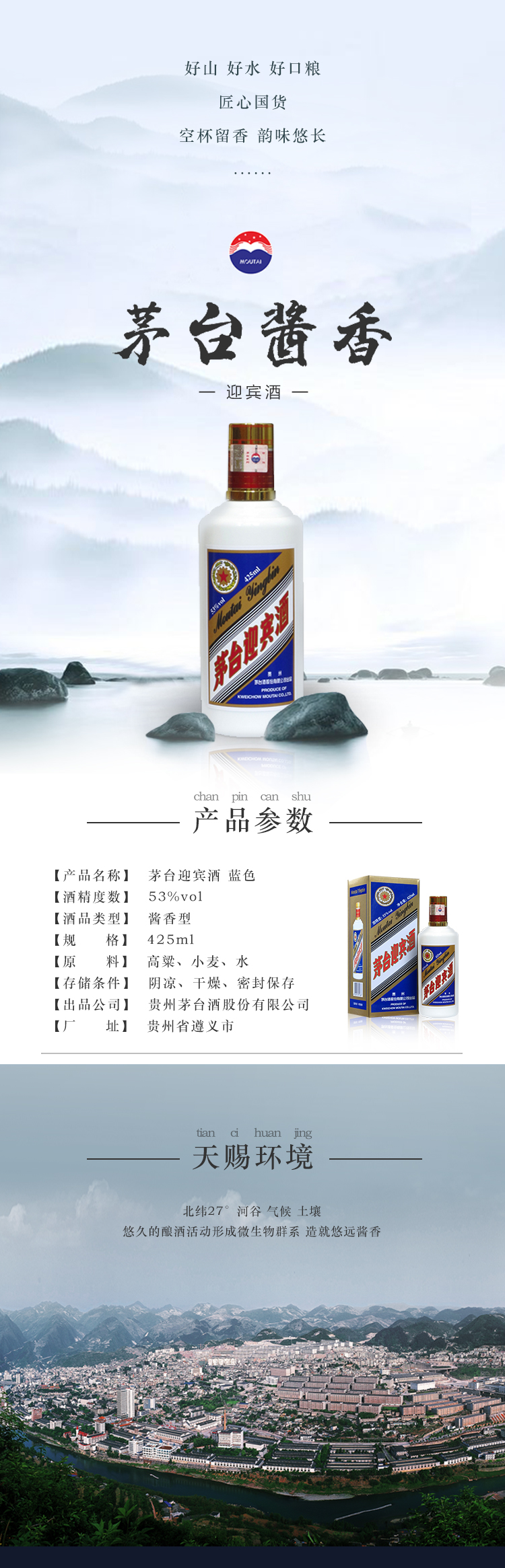 包装:整箱装;容量:376-499mL;香型:酱香型;度数:50度以上;容量:425ml;产品重量(kg):6.3;包装:整箱;存储方法:避光阴凉;酒精度:53度;香型:酱香型;等级:优级;省份:贵州;包装清单:茅台 迎宾蓝色 53度 425ml*6;
