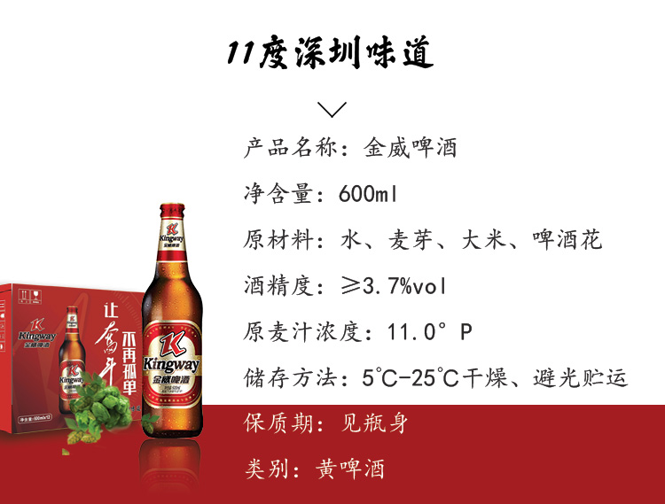 国产/进口:国产;产地:中国大陆;适用场景:家庭聚会,礼节拜访,情侣约会,自斟自饮,派对必备,烧烤撸串,酒吧夜店,野餐出游;包装:瓶装;容量:500mL以上;类别:黄啤酒;原料:水、麦芽、大米、啤酒花;国产/进口:国产;保质期:360天;酒精度:3.7;原产地:中国大陆;原麦汁浓度:11;存储方法:5℃-25℃干燥、避光贮运;类别:黄啤酒;包装:瓶装;容量:600mL;产品重量:13.2kg;包装清单:金威11度老金威600ml瓶整箱12瓶;