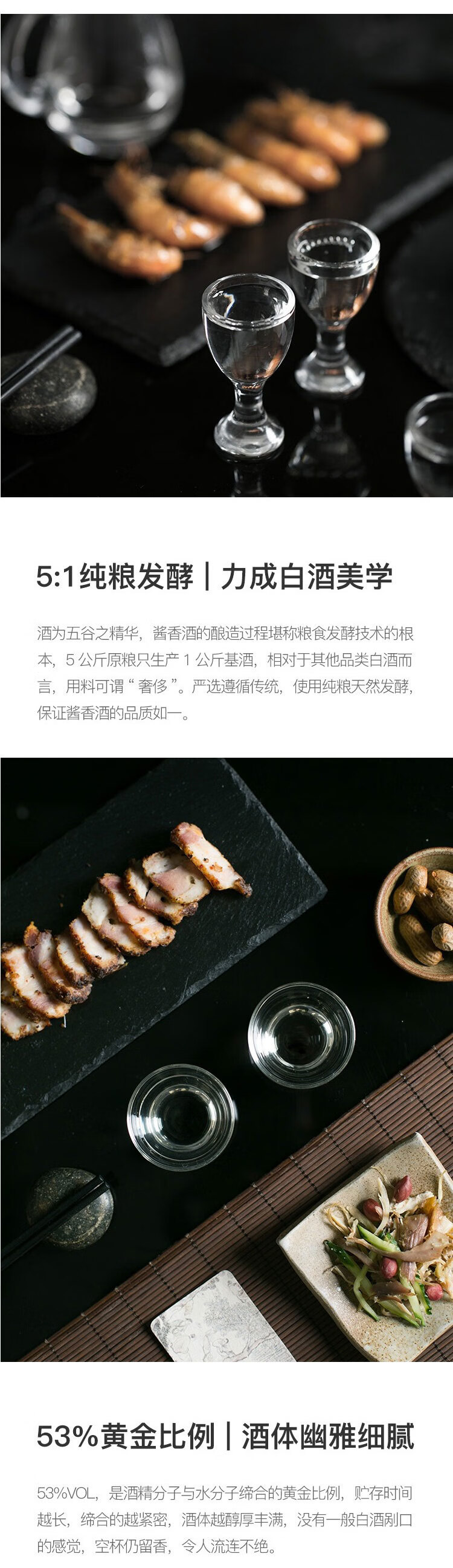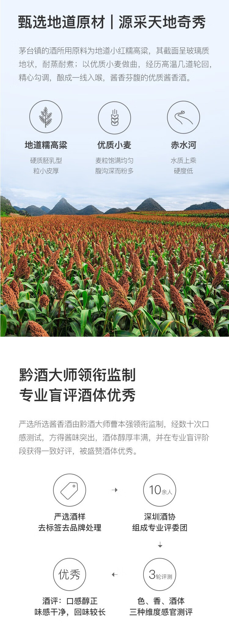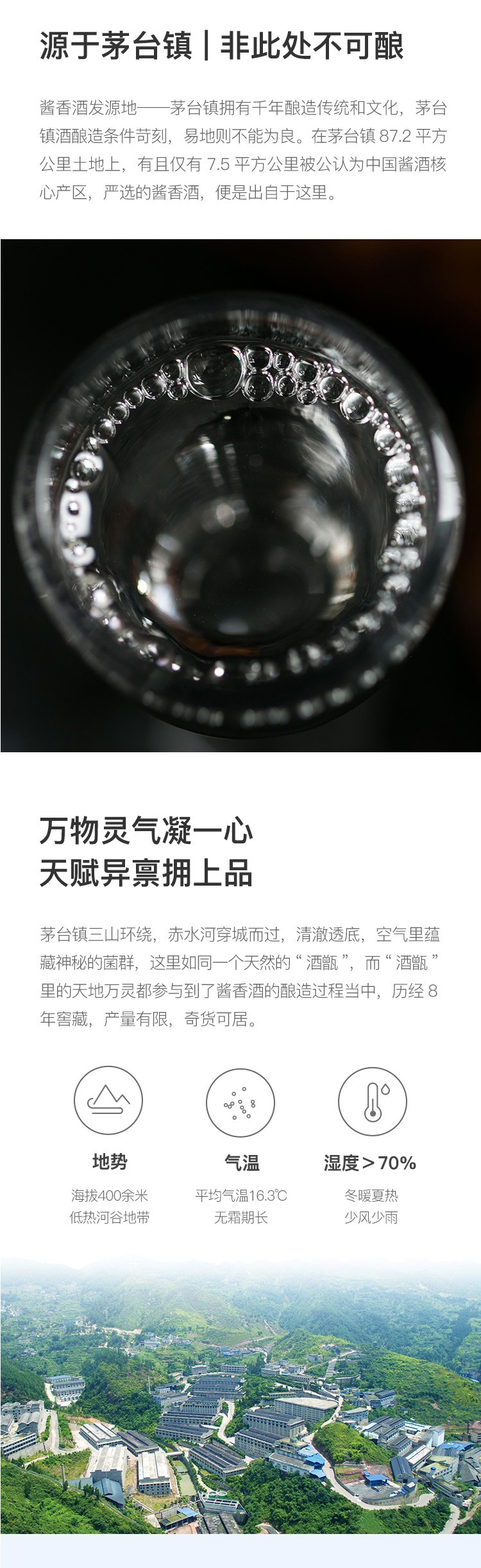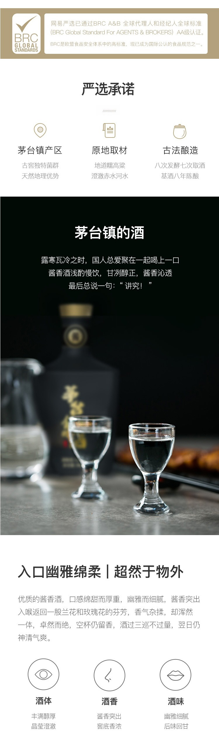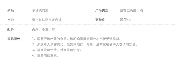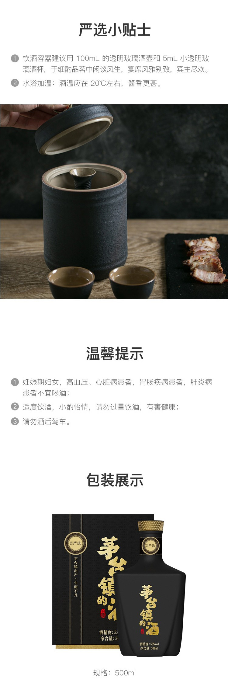 包装:瓶装;容量:376-499mL;香型:酱香型;度数:50度以上;容量:500毫升;产品重量(kg):1.26;包装:单瓶;存储方法:阴凉、通风、干燥处;酒精度:53%Vol;香型:酱香型;等级:酱香型高度白酒;省份:贵州;包装清单:茅台镇的酒 500毫升*1瓶;