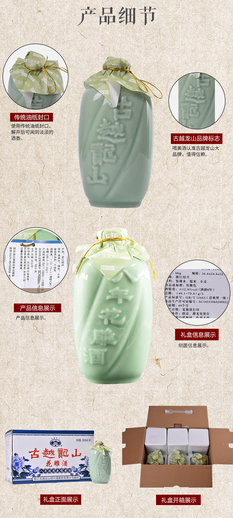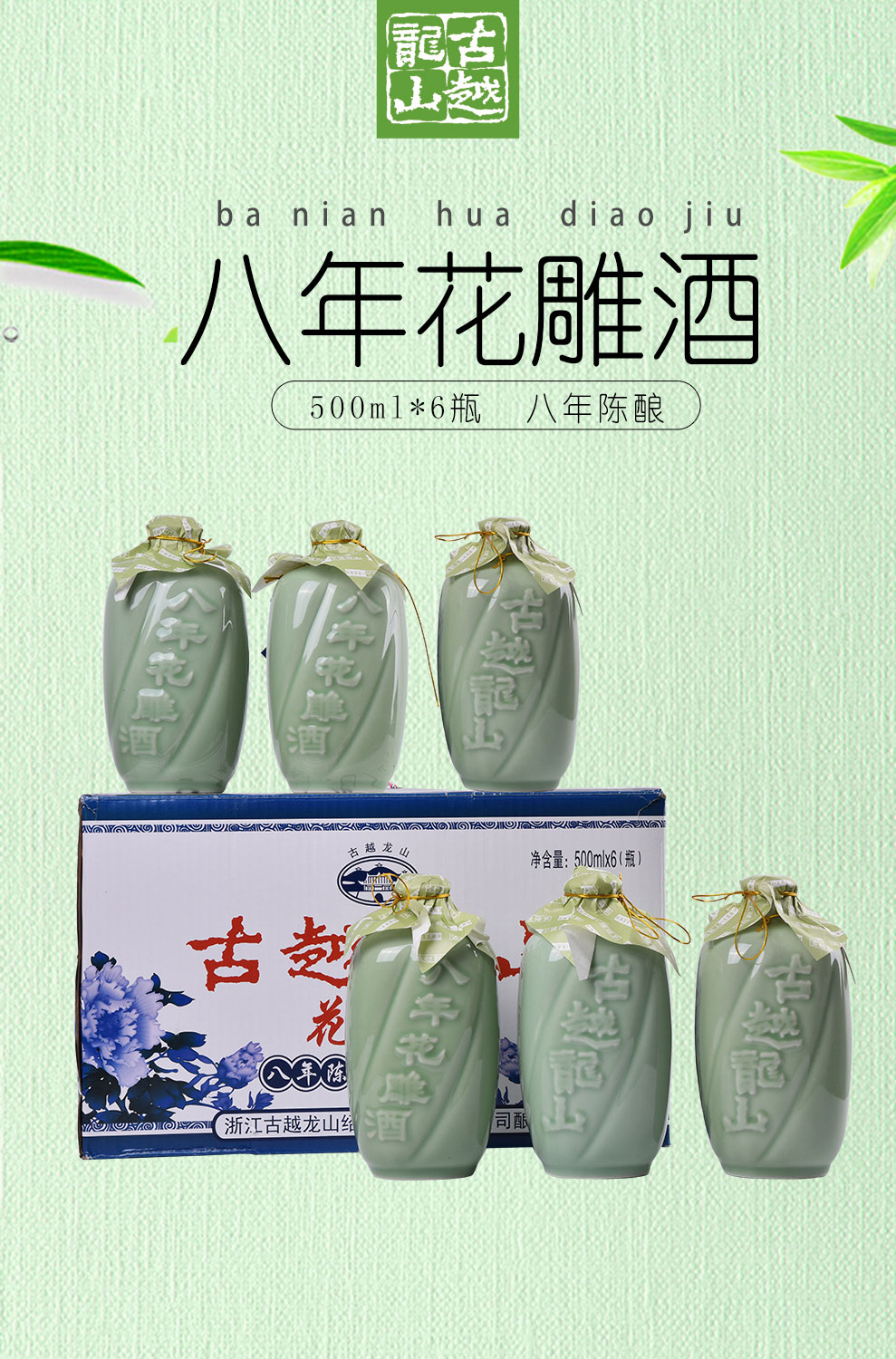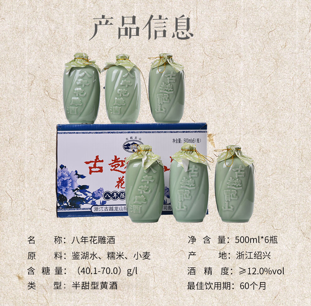 口味:半甜型黄酒(总糖:40.0-100.0g/L);度数:10-19度;产地:浙江;适用场景:商务宴请,礼节拜访,家庭聚会,收藏,朋友小聚,婚宴用酒,自斟自饮;包装:整箱装;容量:500-999mL;保质期:60个月;酒精度:14;存储方法:阴凉、避光处保存;容量:500mL;产品重量:6kg;包装清单:古越龙山 绍兴黄酒 八年陈花雕酒 清爽型 500ml*6瓶 整箱装;