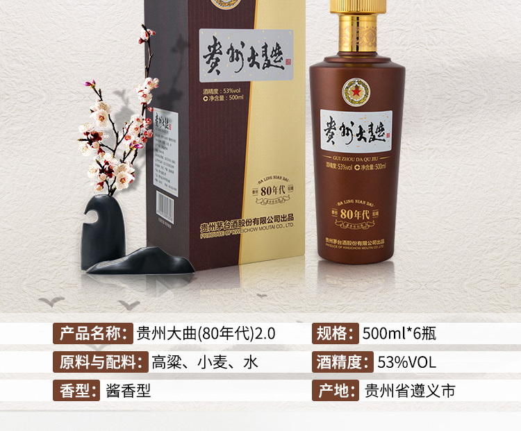 包装:整箱装;容量:500-749mL;香型:酱香型;度数:50度及以上;香型:酱香型;产地:中国大陆;酒精度:53%vol;包装:整箱装;产品重量:8800g;容量:500ml;包装清单:茅台 贵州大曲酒(80年代)(2.0)酱香型白酒 53度500ml*6瓶整箱装*1;