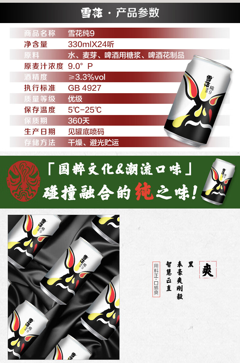 国产/进口:国产;产地:中国大陆;适用场景:家庭聚会,礼节拜访,情侣约会,自斟自饮,派对必备,烧烤撸串,酒吧夜店,野餐出游;包装:听装;容量:330mL;类别:黄啤酒;容量:330ml;产品重量(kg):8.6kg;包装:听装;原料:水、麦芽、啤酒用糖浆、啤酒花制品;存储方法:5℃-25℃ 干燥避光贮运;原麦汁浓度:9.0°P;酒精度:≥3.3%vol;国产/进口:国产;保质期:360天;原产地:中国;类别:黄啤酒;包装清单:雪花啤酒(Snowbeer) 纯9(冰酷升级版) 330ml*24听 整箱装;