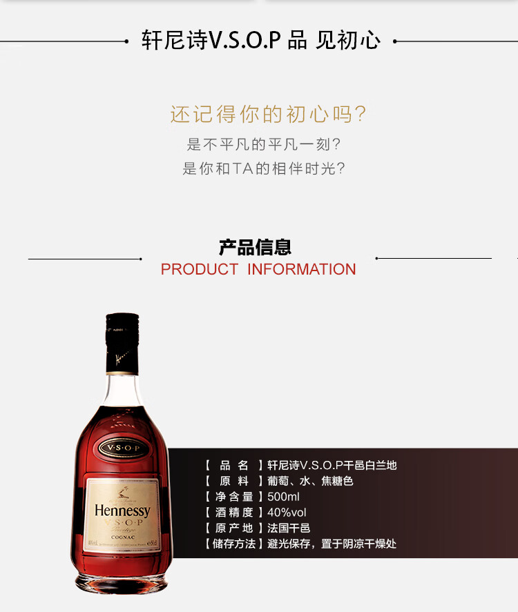特性:VSOP;国产/进口:进口;产地:法国;适用场景:家庭聚会,商务宴请,情侣约会,自斟自饮,亲友馈赠,闺蜜私语;包装:瓶装;容量:500-699mL;原料:葡萄、水、焦糖色;保质期:长期;酒精度:40%vol;存储方法:阴凉避光;产品重量:1.1kg;容量:500mL;包装清单:轩尼诗(Hennessy)洋酒 V.S.O.P干邑白兰地 500ml*1;