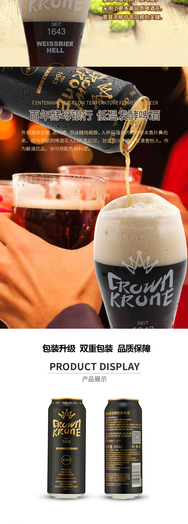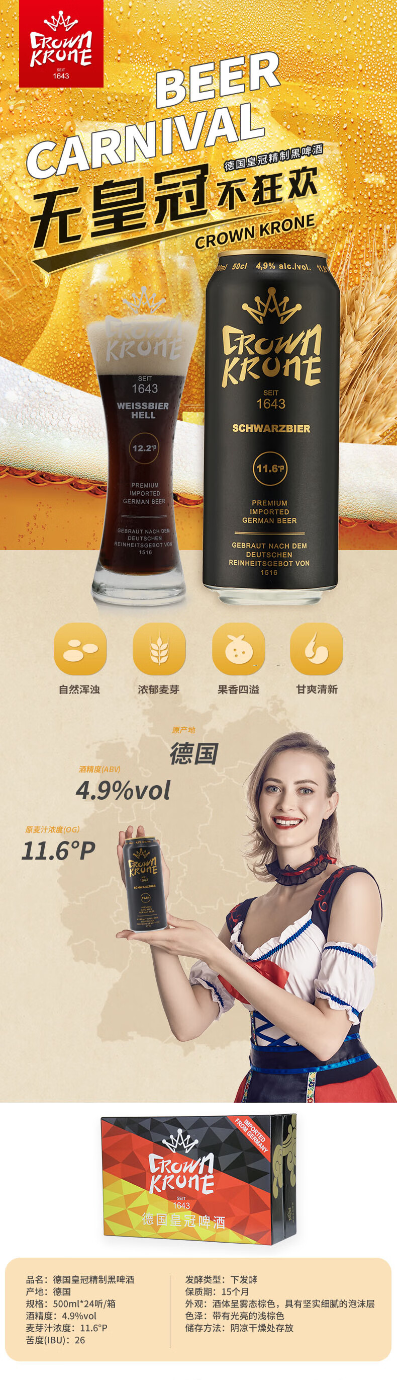 国产/进口:进口;产地:德国;适用场景:野餐出游,礼节拜访,家庭聚会,自斟自饮,情侣约会,烧烤撸串,派对必备,酒吧夜店;包装:听装;容量:500mL;类别:黑啤酒;原料:水、大麦麦芽、啤酒花、烘焙麦芽;保质期:15个月;酒精度:4.9%vol;原产地:德国;原麦汁浓度:11.6;存储方法:常温储存,请置于阴凉干燥处;产品重量:13kg;容量:500;包装清单:德国皇冠精制黑啤酒(箱)500ml*24听;