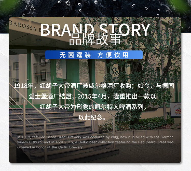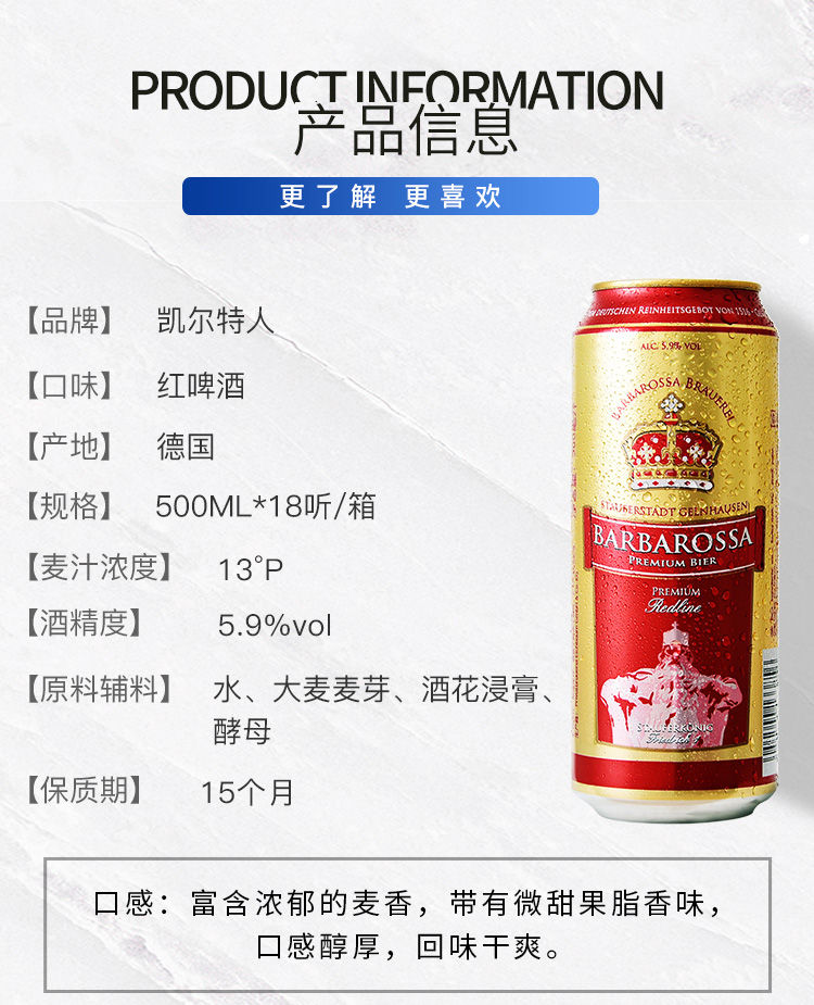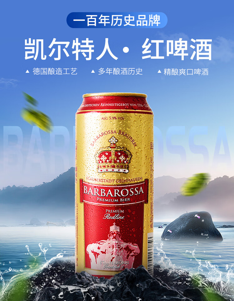 国产/进口:进口;产地:德国;适用场景:礼节拜访,家庭聚会,自斟自饮,情侣约会,烧烤撸串,派对必备,酒吧夜店;包装:听装;容量:500mL;类别:黑啤酒;原料:水,大麦麦芽,酵母,酒花浸膏;保质期:15个月;酒精度:5.9;原产地:德国;原麦汁浓度:13;存储方法:常温保存,请置于阴凉干燥处,8-10℃饮用更佳;产品重量:10kg;容量:500ml;包装清单:德国进口凯尔特人红啤酒500ml* 18听;