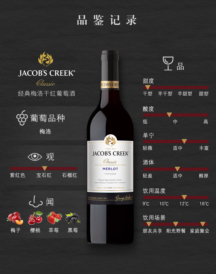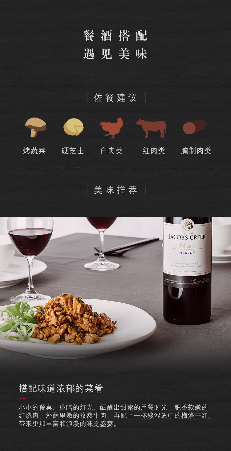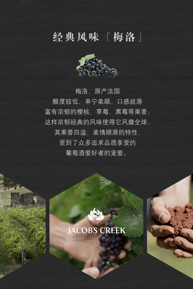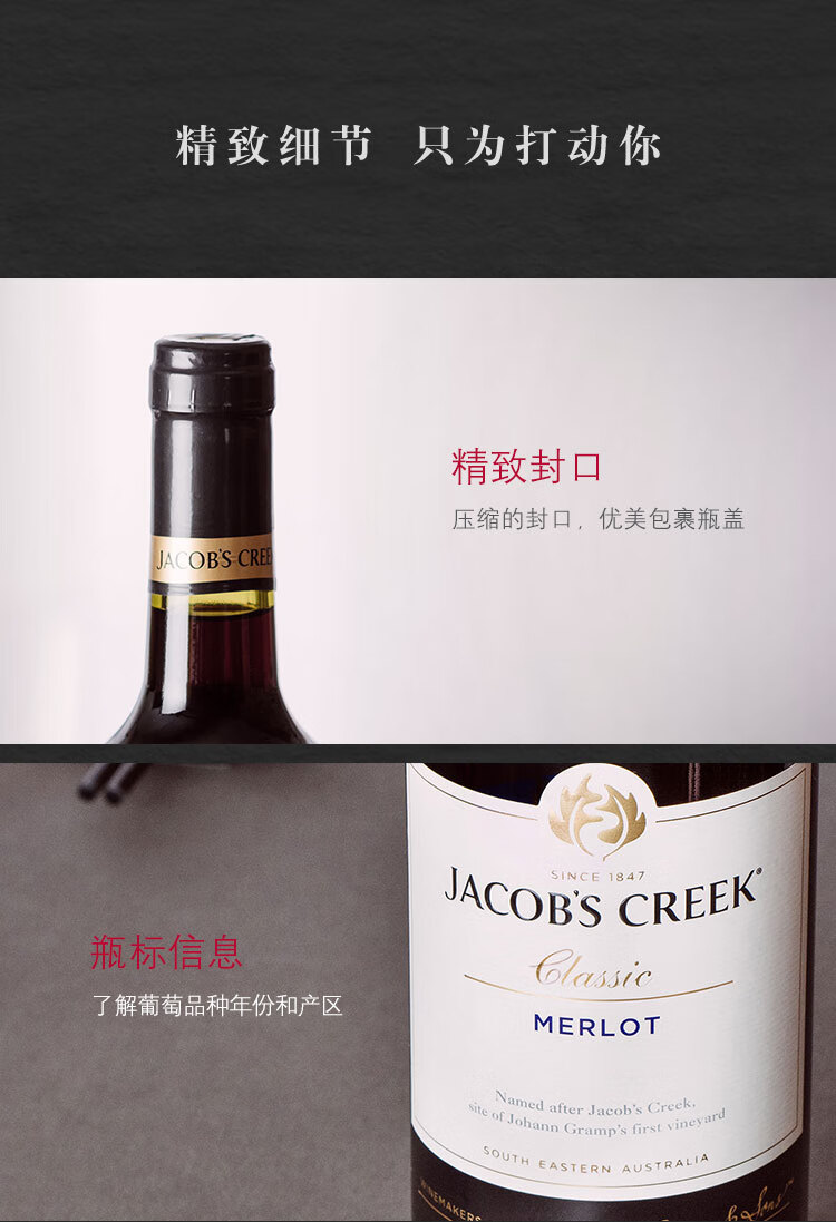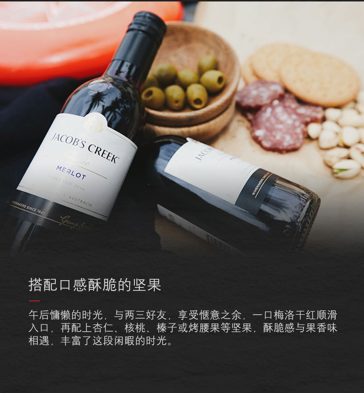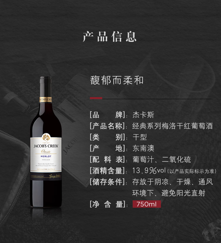颜色:宝石红;口感:强劲;特性:列级庄;国产/进口:进口;适用场景:家庭聚会,礼节拜访,商务宴请,婚礼婚宴,情侣约会,自斟自饮,闺蜜私语,派对活动;包装:瓶装;酸度:高酸;类别:红葡萄酒;葡萄品种:梅洛(Merlot);类型:静止酒;香型:果香;产地:澳大利亚;容量:750mL;甜度:干型;保质期:长期;酒精度:详见酒标;原产地:澳大利亚;存储方法:存放于阴凉、干燥、通风环境下。避免阳光直射;容量:750ml;产品重量:7.83kg;包装清单:杰卡斯(Jacob’s Creek) 经典梅洛干红葡萄酒 750ml*6 整箱装 澳大利亚进口红酒;