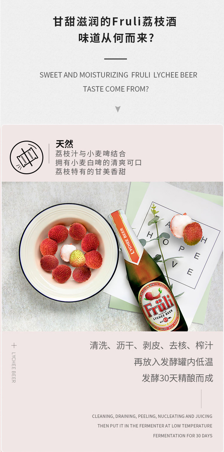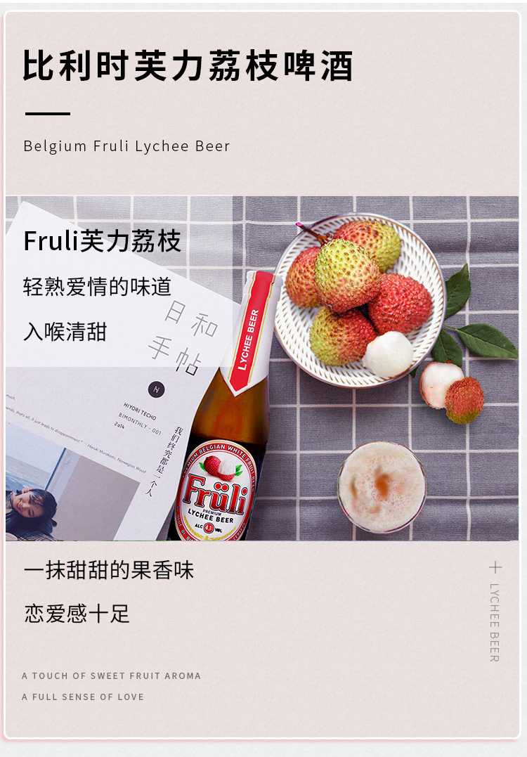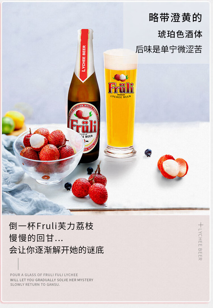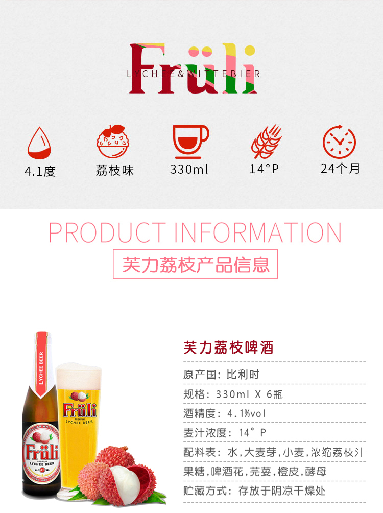 国产/进口:进口;产地:比利时;适用场景:家庭聚会,礼节拜访,情侣约会,自斟自饮,派对必备,烧烤撸串,酒吧夜店,野餐出游;包装:组合装;容量:330mL;类别:精酿;容量:330ml;产品重量(kg):3.56;包装:组合装;原料:水、大麦芽、小麦、浓缩荔枝汁、果糖、啤酒花、芫荽、橙皮、酵母;存储方法:存放于阴凉干燥处,冷藏后饮用效果更佳;原麦汁浓度:14;酒精度:4.1;国产/进口:进口;保质期:730;原产地:比利时;类别:精酿;包装清单:330ml*6;