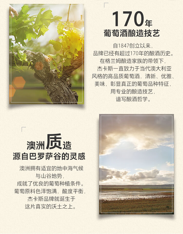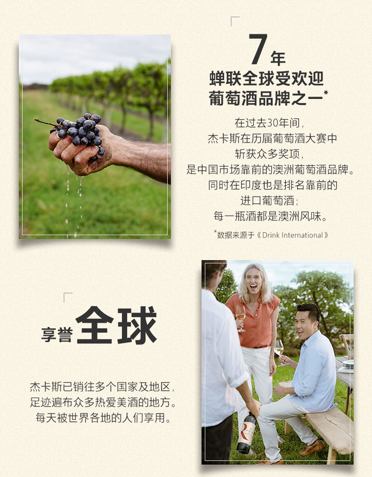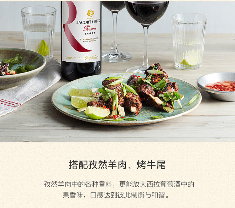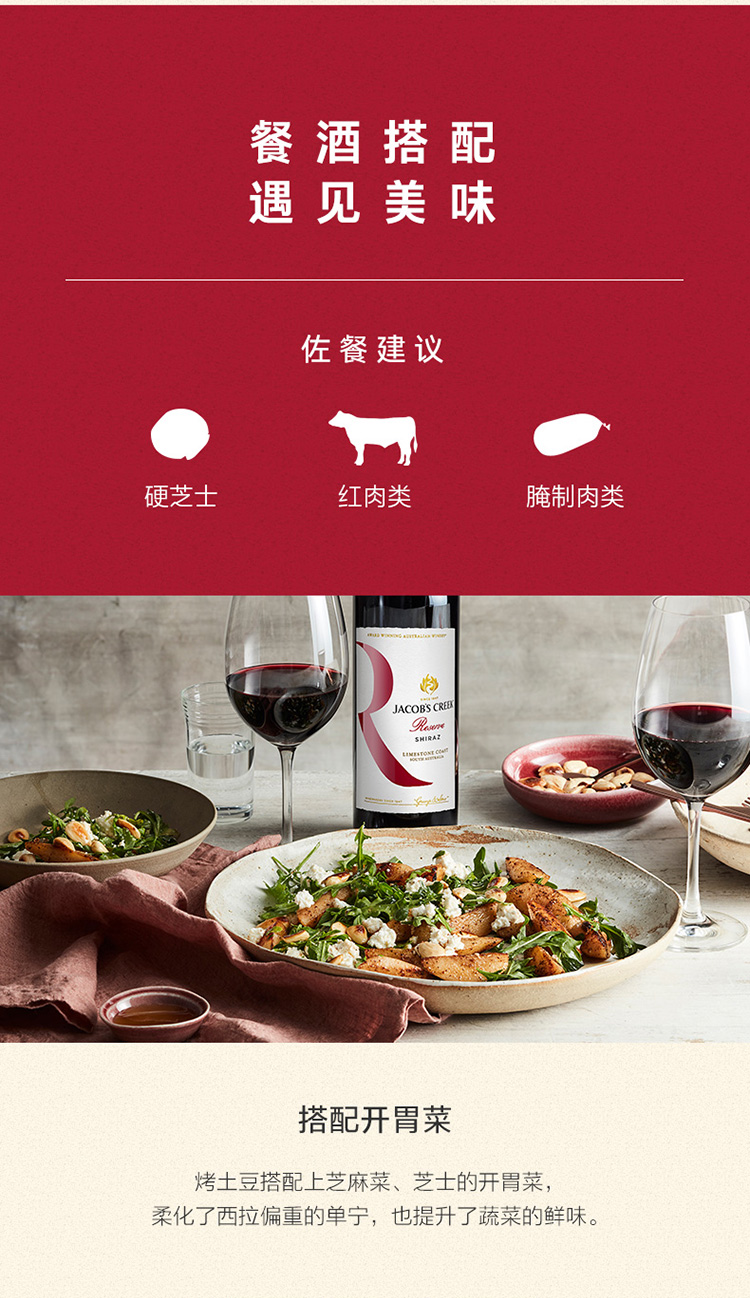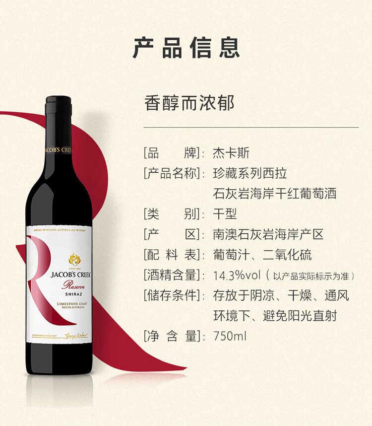 颜色:宝石红;口感:饱满;特性:中级庄;国产/进口:进口;适用场景:家庭聚会,礼节拜访,商务宴请,婚礼婚宴,情侣约会,自斟自饮,闺蜜私语,派对活动;包装:瓶装;酸度:中酸;类别:红葡萄酒;葡萄品种:西拉/设拉子(Syrah/Shiraz);类型:静止酒;香型:果香;产地:澳大利亚;容量:750mL;甜度:干型;保质期:长期;酒精度:14.3%vol;原产地:澳大利亚;存储方法:存放于阴凉、干燥、通风环境下。避免阳光直射;容量:750ml;产品重量:7.9kg;包装清单:杰卡斯(Jacob’s Creek) 西拉珍藏巴罗萨干红葡萄酒 750ml*6 整箱装 澳大利亚进口红酒;