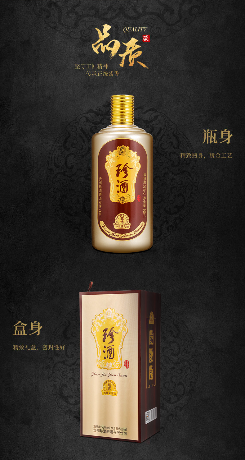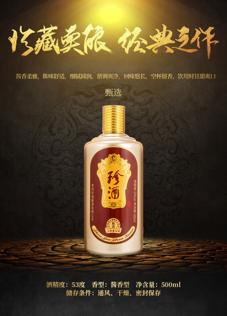 包装:瓶装;容量:500-749mL;香型:酱香型;产地:贵州;度数:50度及以上;酒精度:53%vol;容量:500ml;产品重量:550g;包装清单:珍酒 甄选 酱香型白酒 53度 500ml 单瓶装*1;