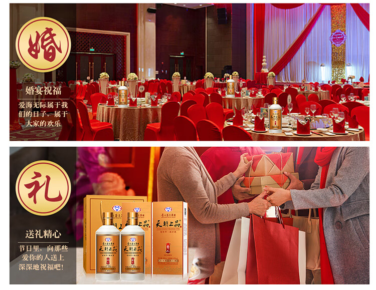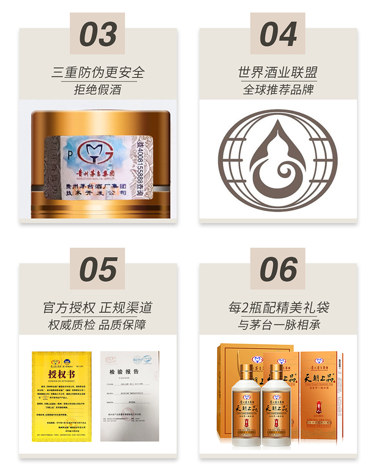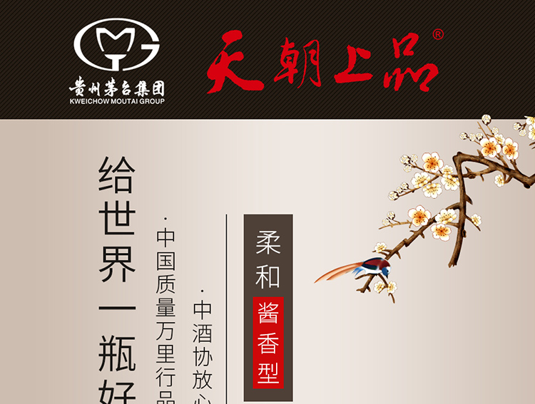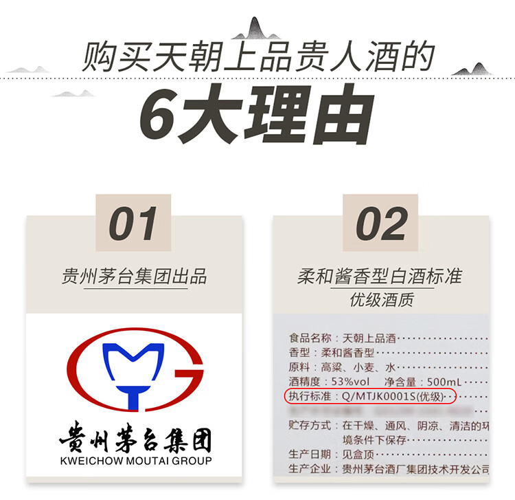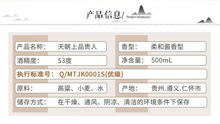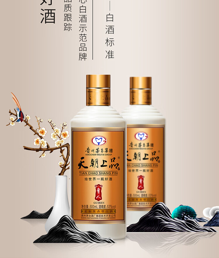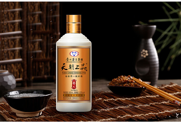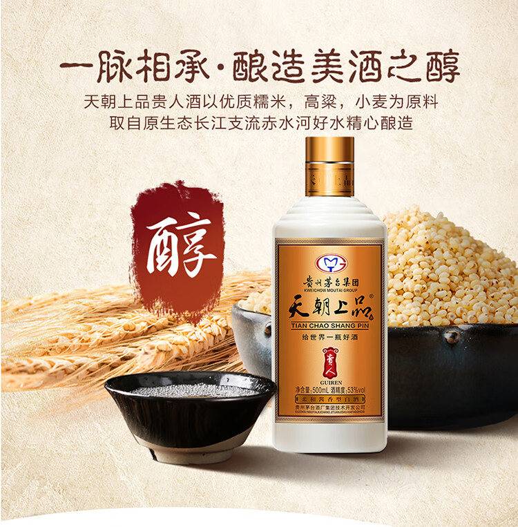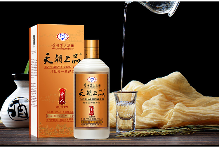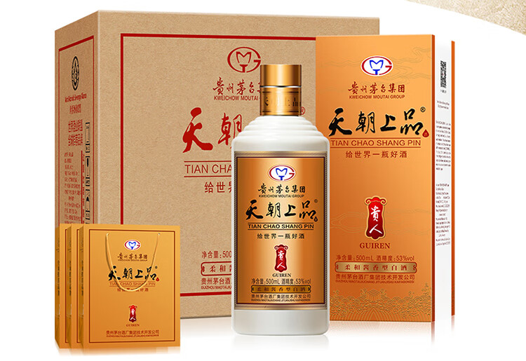 包装:整箱装;容量:500-749mL;香型:酱香型;产地:贵州;度数:50度及以上;酒精度:53%vol;容量:500ml;产品重量:1g;包装清单:茅台集团技开公司 天朝上品贵人53度500ml*6瓶 礼袋*3;