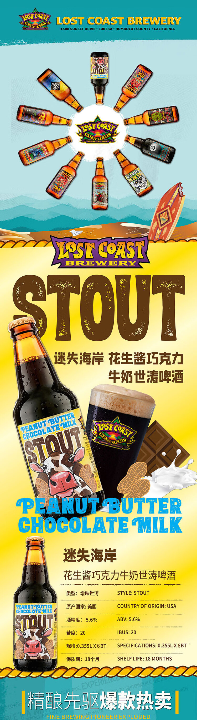 国产/进口:进口;产地:美国;适用场景:家庭聚会,情侣约会,自斟自饮,派对必备,烧烤撸串,酒吧夜店,野餐出游;包装:组合装;容量:331-499mL;类别:精酿;原料:水、麦芽、花生酱、巧克力、乳糖、啤酒花、酵母;保质期:18个月;酒精度:5.6% vol;原产地:美国;原麦汁浓度:13.8°P;存储方法:存放于阴凉干燥处,请勿倒置,冰镇后饮用更佳;容量:355ml;产品重量:3.56kg;包装清单:迷失海岸(LOST COAST)花生酱巧克力牛奶世涛啤酒355ml*6;