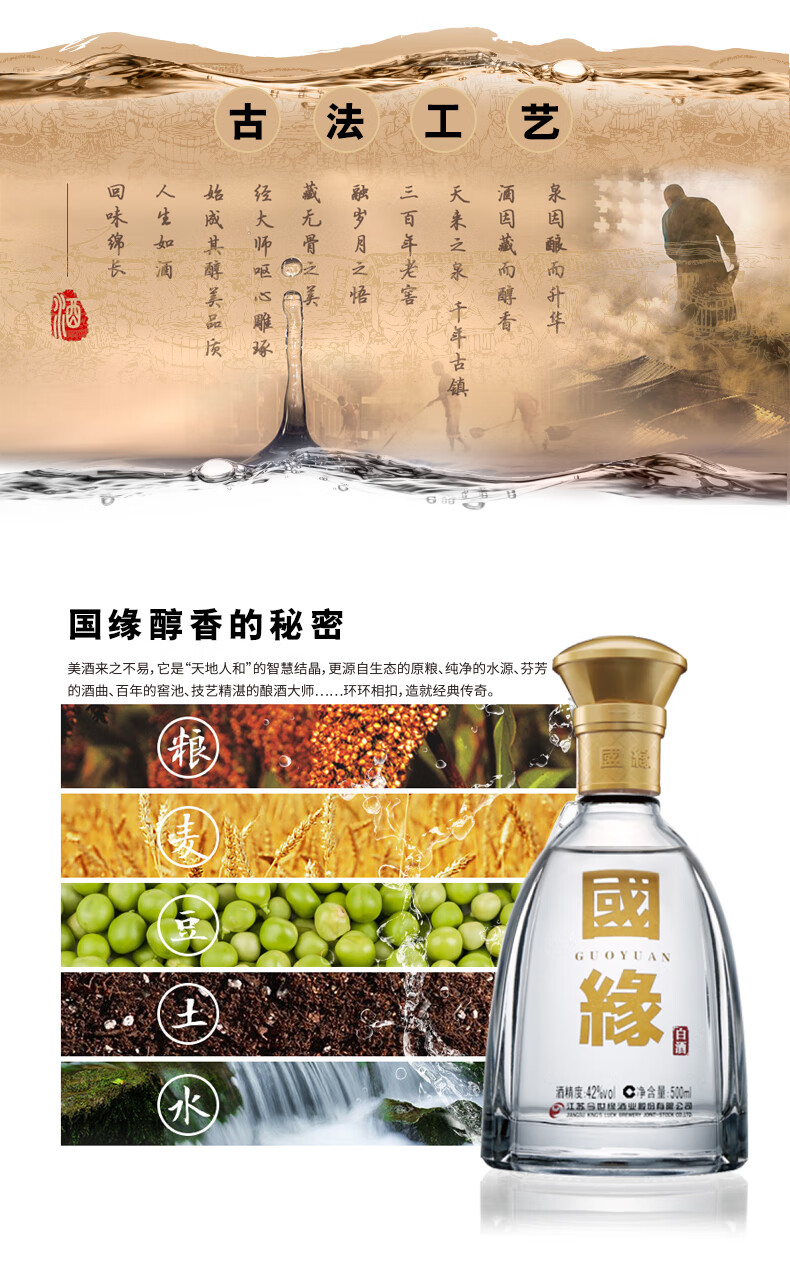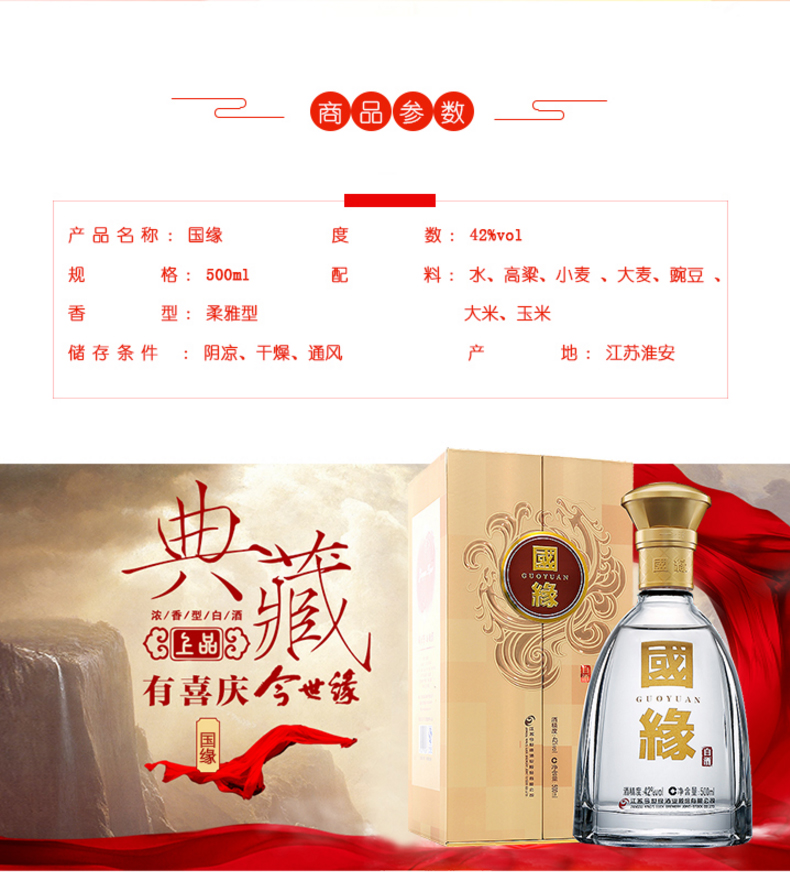 包装:瓶装;容量:500-749mL;香型:浓香型;产地:江苏;度数:40-49度;酒精度:42%vol;容量:500ml;产品重量:1200g;包装清单:1;