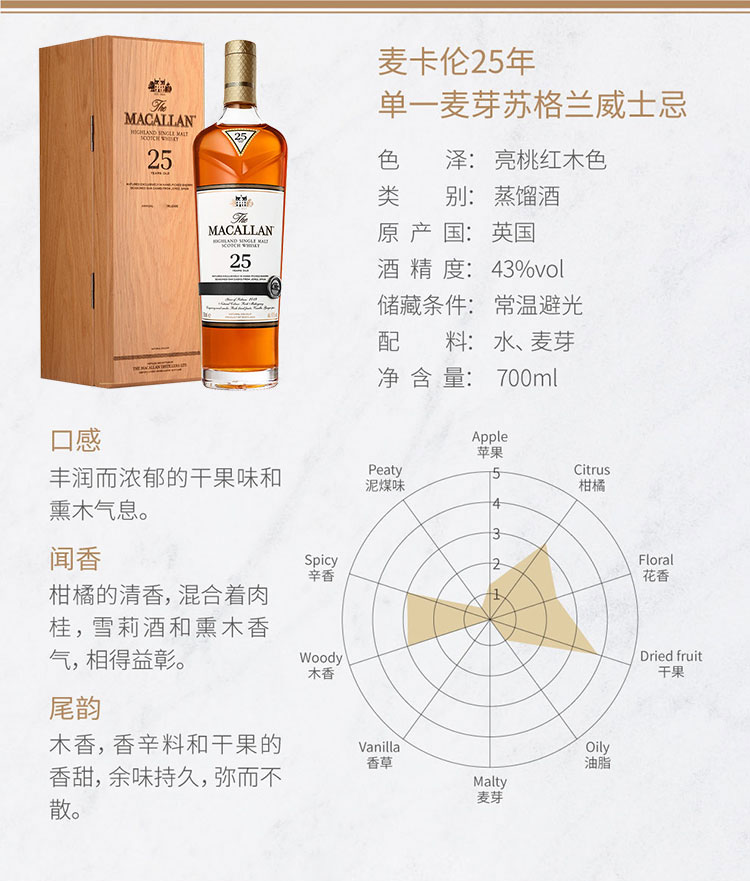 类型:单一麦芽威士忌;产地:苏格兰;适用场景:自斟自饮,亲友馈赠,家庭聚会,商务宴请;包装:瓶装;容量:700-999mL;阶段:进阶优选;原料:水、大麦芽;保质期:无;酒精度:43%vol;存储方法:避光常温;产品重量:4kg;容量:700mL;包装清单:麦卡伦(MACALLAN)25年单一麦芽苏格兰威士忌700ml *1;