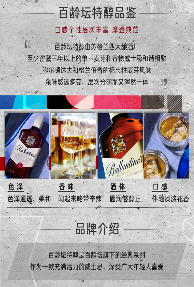 类型:调和威士忌;产地:苏格兰;适用场景:自斟自饮,亲友馈赠,家庭聚会,商务宴请,情侣约会,闺蜜私语;包装:瓶装;容量:700-999mL;阶段:进阶优选;原料:水、麦芽、焦糖色;保质期:无;酒精度:40%vol;存储方法:常温避光;产品重量:1.3kg;容量:700mL;包装清单:百龄坛(Ballantine’s)洋酒 特醇 苏格兰 威士忌 真现场限量装 700ml*1;
