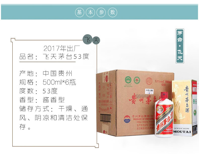 包装:整箱装;容量:376-499mL;香型:酱香型;产地:贵州;度数:50度及以上;酒精度:53%vol;容量:500ml;产品重量:3000g;包装清单:茅台 飞天 2017年出厂 酱香型白酒 53度 500ml*6瓶装*1;