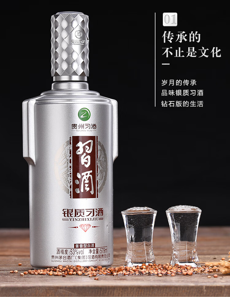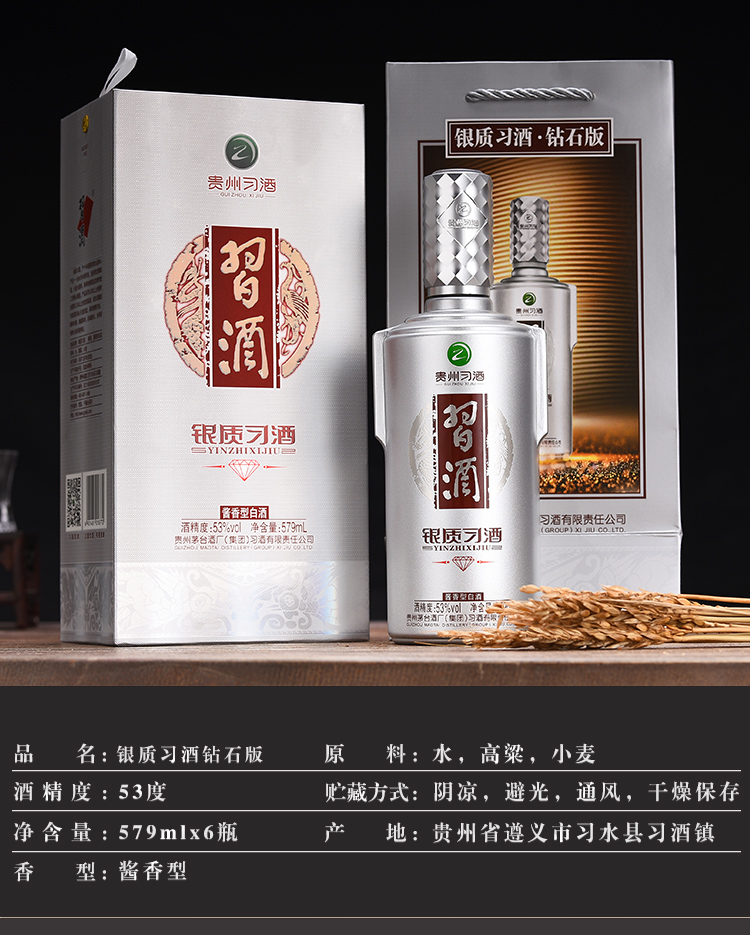 包装:整箱装;容量:500-749mL;香型:酱香型;产地:贵州;度数:50度及以上;酒精度:53%vol;容量:579;产品重量:12000g;包装清单:习酒 银质(钻石版)53度 579ml*6瓶 整箱装*1;