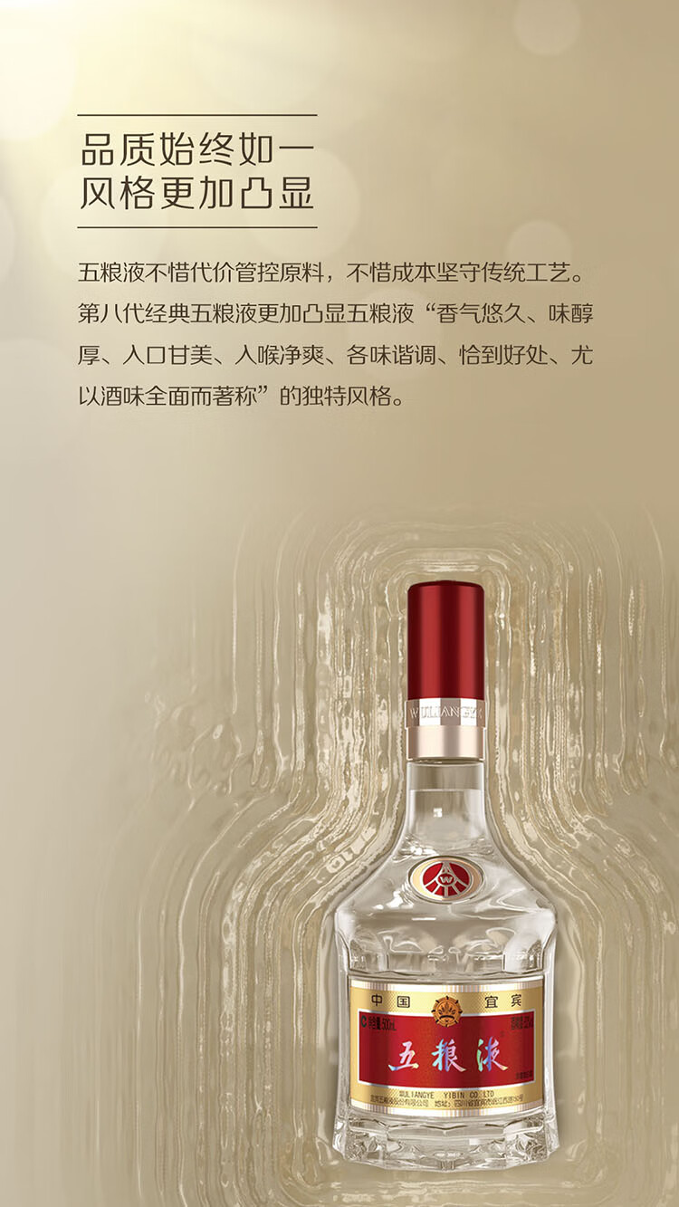 包装:瓶装;容量:500-749mL;香型:浓香型;度数:50度及以上;香型:浓香型;产地:四川;酒精度:52%vol;包装:瓶装;产品重量:1485g;容量:500mL;包装清单:五粮液52度普五第八代款单瓶500毫升;