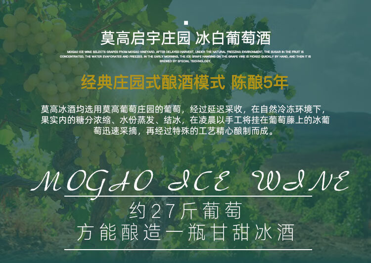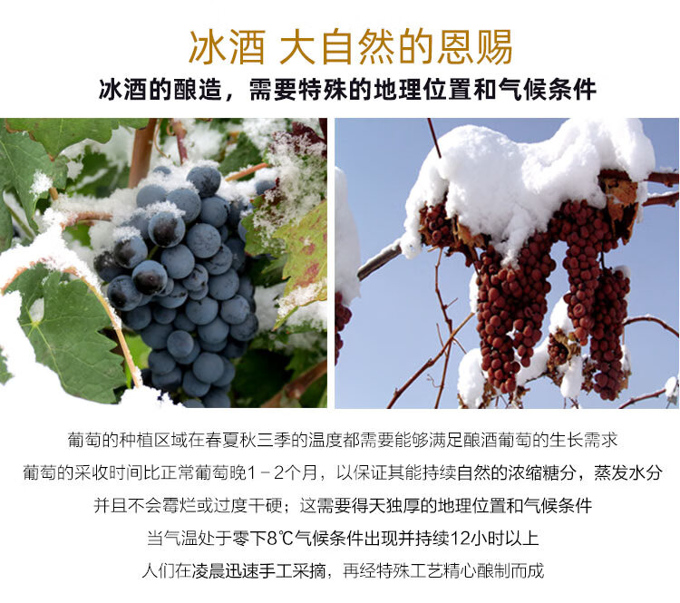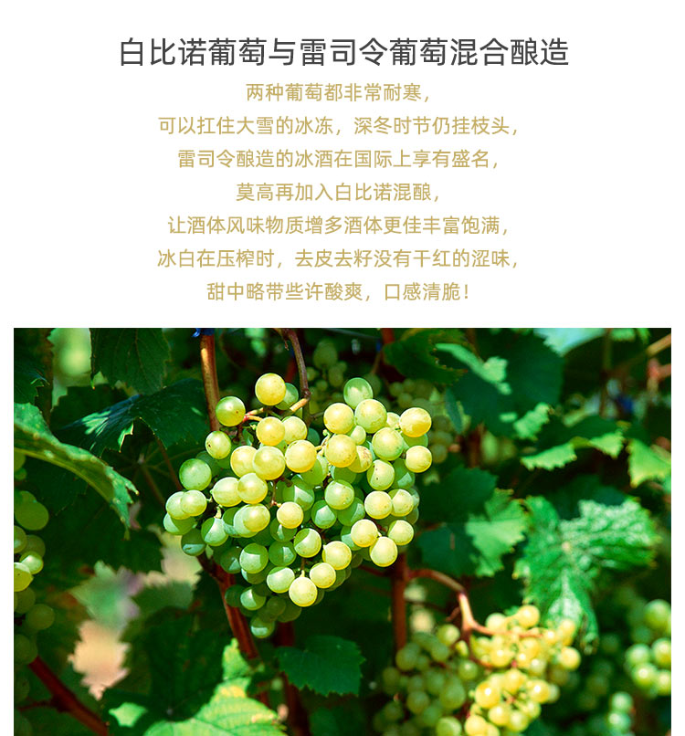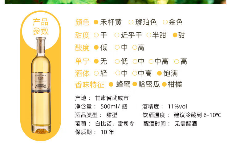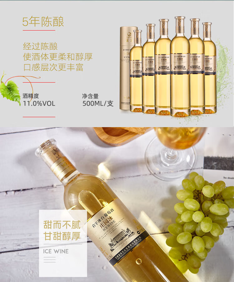 颜色:琥珀;口感:香甜;特性:普通餐酒;国产/进口:国产;适用场景:礼节拜访,商务宴请,婚礼婚宴,情侣约会,家庭聚会,自斟自饮,闺蜜私语,派对活动;包装:整箱装;酸度:低酸;类别:冰酒/贵腐/甜酒;葡萄品种:雷司令(Riesling);类型:静止酒;香型:果香;产地:中国大陆;容量:376-749mL;甜度:甜型;系列:冰酒系列;保质期:10年;酒精度:11%vol;原产地:中国大陆;存储方法:恒温避光;容量:500ml/瓶;产品重量:8.24kg;包装清单:莫高庄园冰酒(冰白)500ml*6瓶;