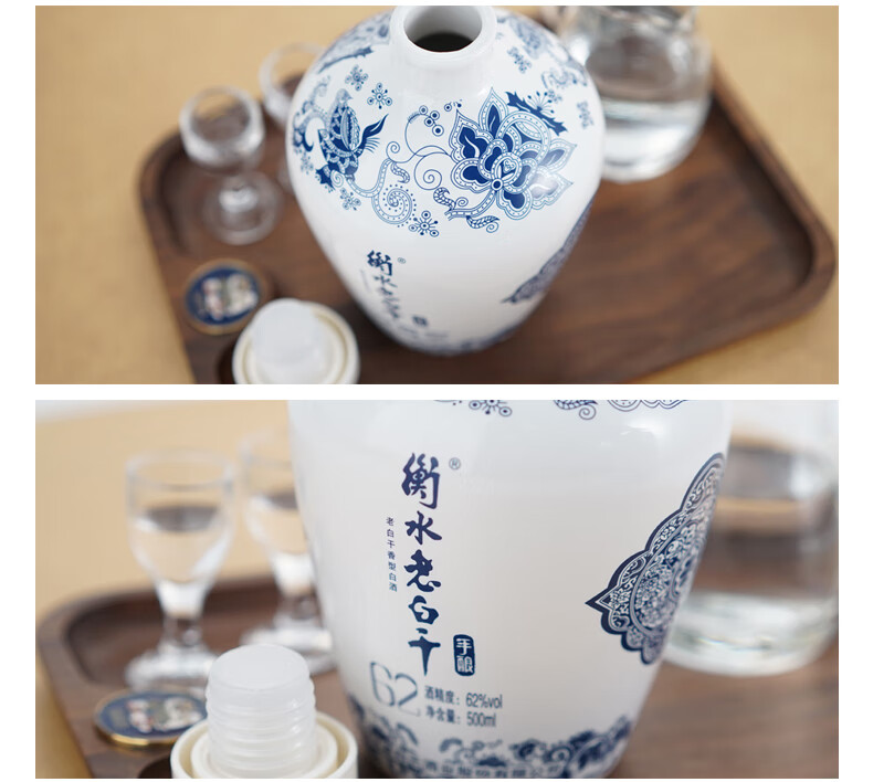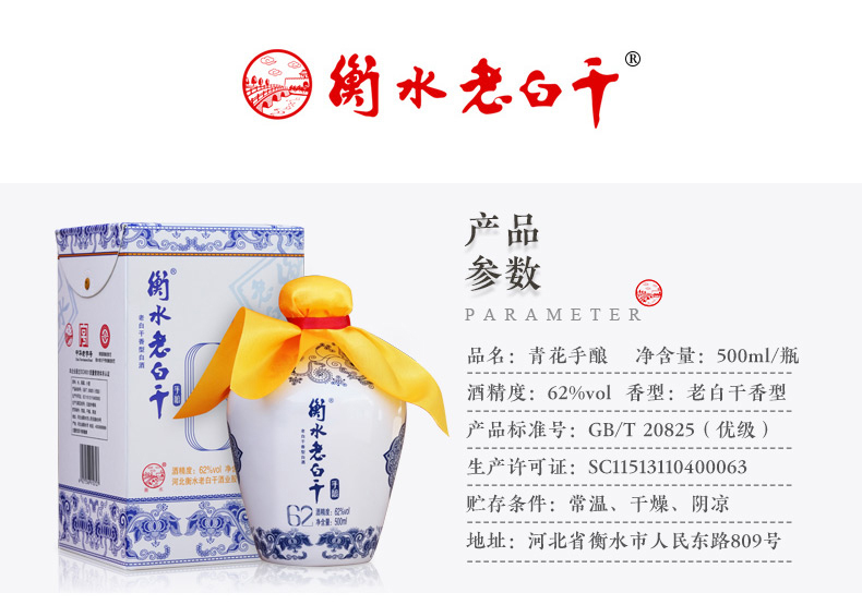 包装:瓶装;容量:500-749mL;香型:老白干香型;度数:50度及以上;香型:老白干香型;产地:河北衡水;酒精度:62%vol;包装:瓶装;产品重量:1070g;容量:500ml;包装清单:衡水老白干青花手酿62度500ml白酒一瓶;