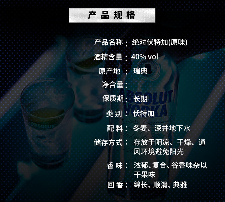 类型:调和威士忌;产地:苏格兰;适用场景:自斟自饮,亲友馈赠,家庭聚会,商务宴请,情侣约会;包装:组合装;容量:500-699mL;阶段:小白入门;原料:水、麦芽、焦糖色;保质期:长期;酒精度:40%vol;存储方法:常温避光;产品重量:2.4kg;容量:500mL;包装清单:百龄坛特醇500ml+绝对伏特加原味500ml 洋酒 威士忌+伏特加 套装*1;