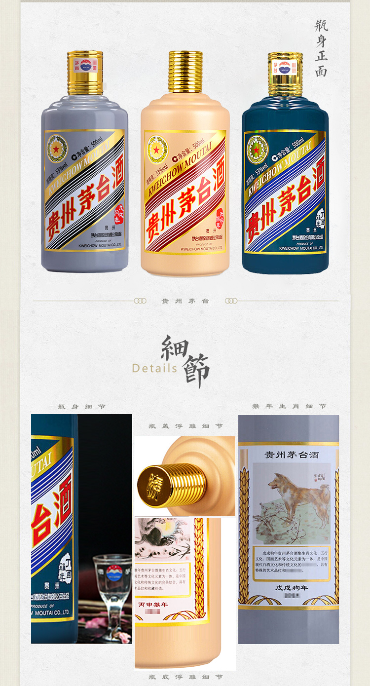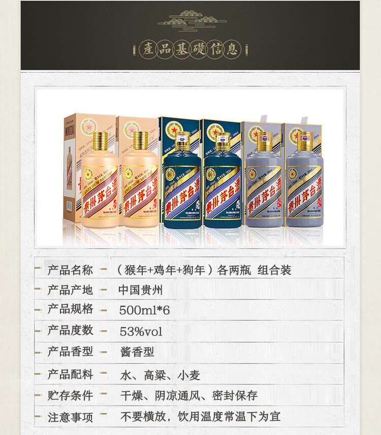 包装:瓶装;容量:500-749mL;香型:酱香型;产地:贵州;度数:50度及以上;酒精度:53%vol;容量:500ml;产品重量:3000g;包装清单:茅台 生肖系列(猴年+鸡年+狗年)各两瓶 组合装 53度 500ml*6瓶 酱香型白酒*1;