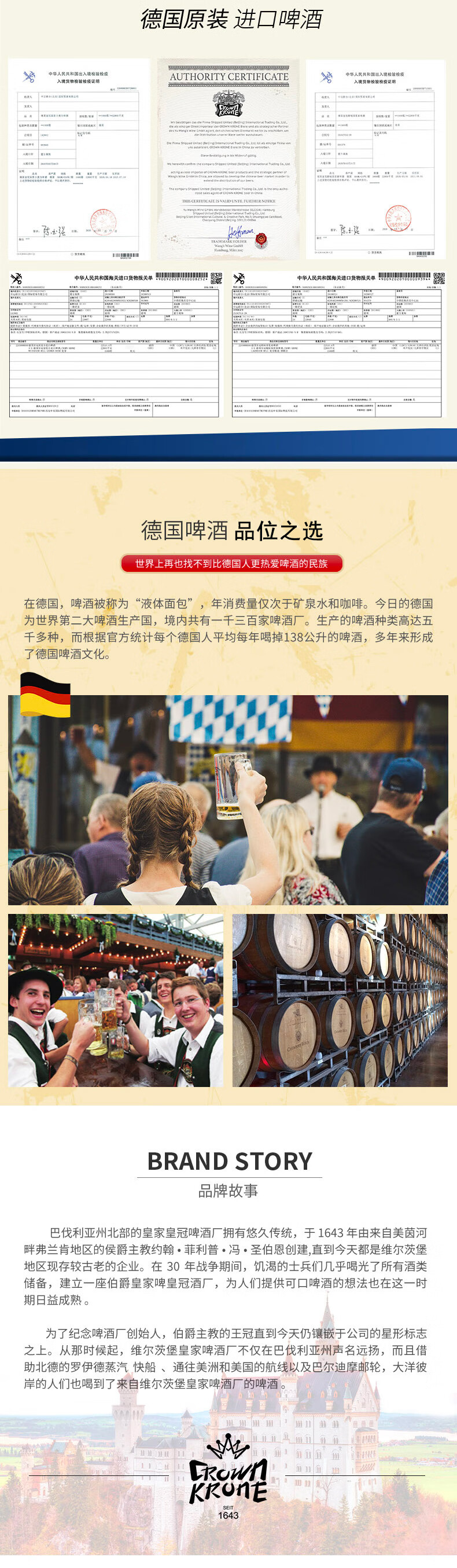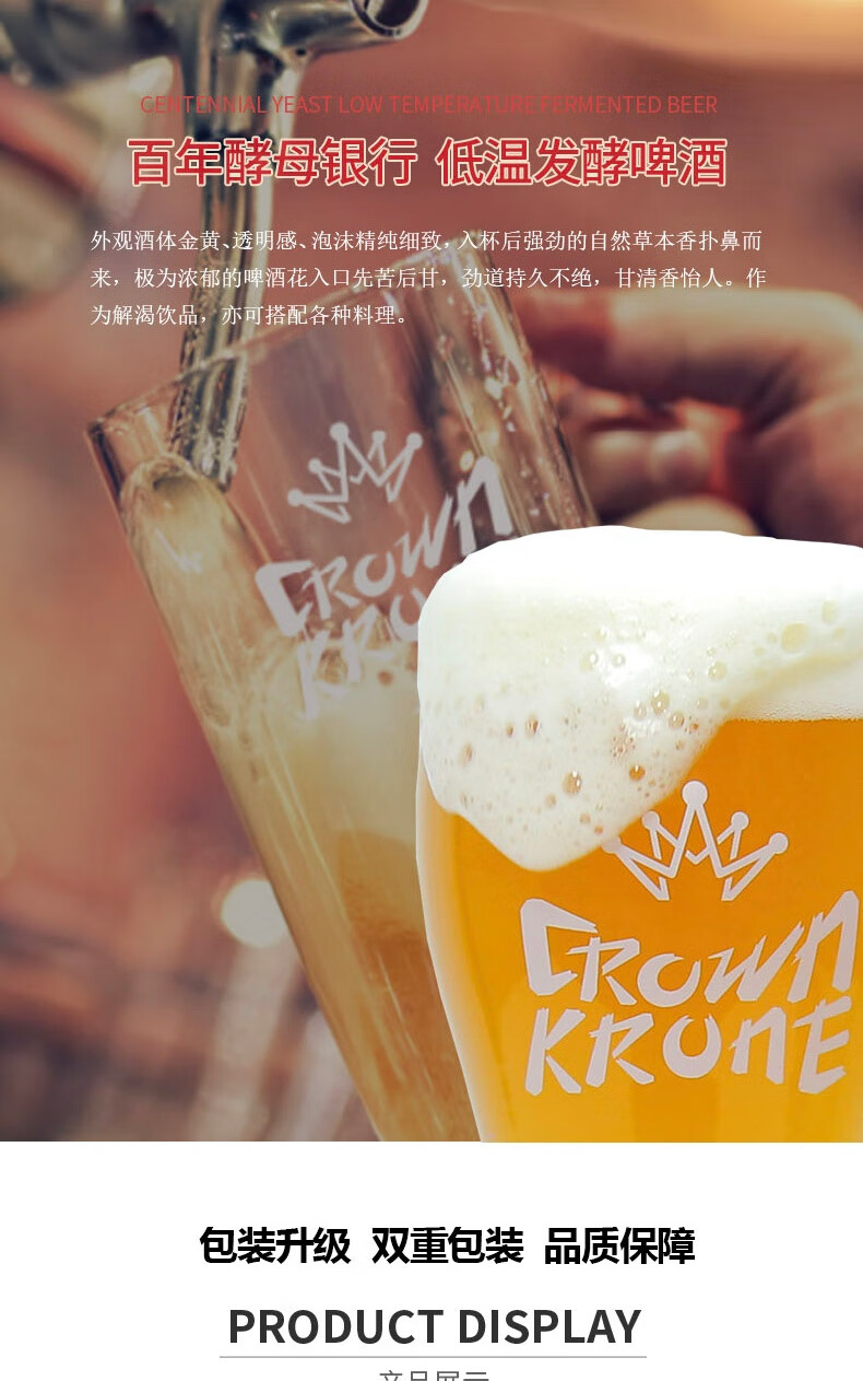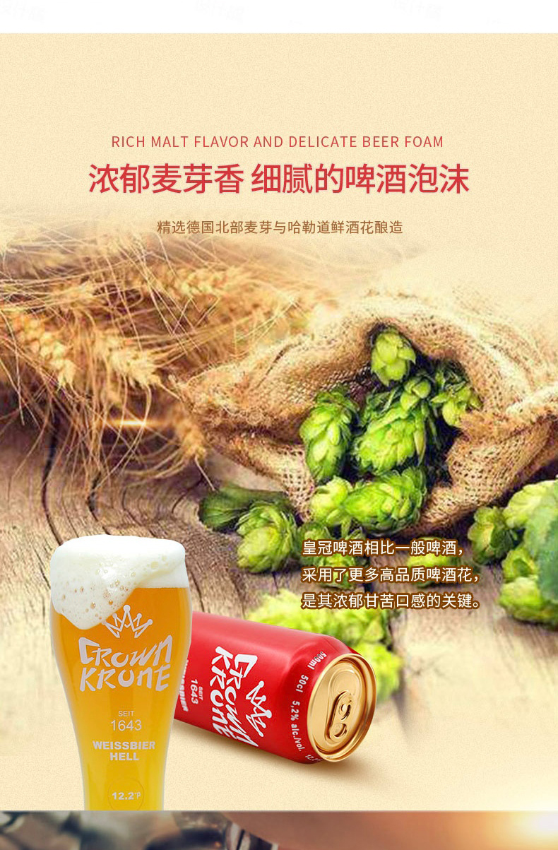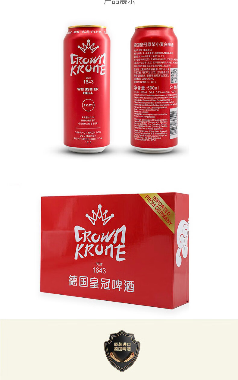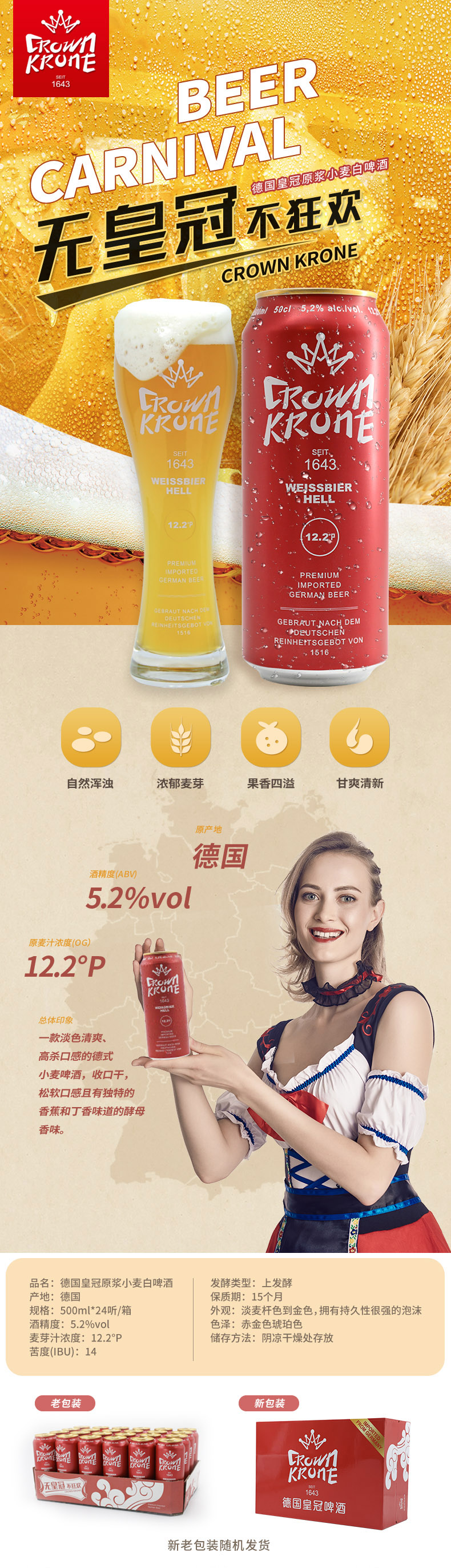 国产/进口:进口;产地:德国;适用场景:野餐出游,礼节拜访,家庭聚会,自斟自饮,情侣约会,烧烤撸串,派对必备,酒吧夜店;包装:听装;容量:500mL;类别:白啤酒;原料:水、小麦麦芽、大麦麦芽、啤酒花、酵母;保质期:15个月;酒精度:5.2%vol;原产地:德国;原麦汁浓度:12.2;存储方法:常温储存,请置于阴凉干燥处;产品重量:13kg;容量:500;包装清单:德国皇冠原浆小麦白啤酒(箱)500ml*24听;