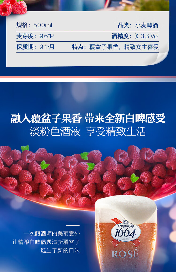 国产/进口:国产;产地:中国大陆;适用场景:家庭聚会,礼节拜访,情侣约会,自斟自饮,派对必备,烧烤撸串,酒吧夜店,野餐出游;包装:听装;容量:500mL;类别:白啤酒;原料:水、大麦麦芽、小麦、果葡糖浆、白砂糖、食用香精、柠檬酸、复合浓缩汁(胡萝卜、黑加仑)、啤酒花;保质期:9个月;酒精度:3.3%vol;原产地:中国大陆;原麦汁浓度:9.6p;存储方法:阴凉,通风;产品重量:6.5kg;容量:500ml;包装清单:1664啤酒 桃红啤酒500ml*12罐 整箱装;