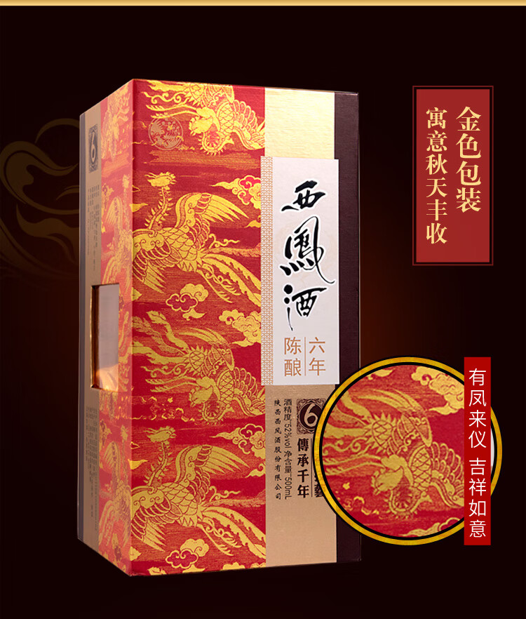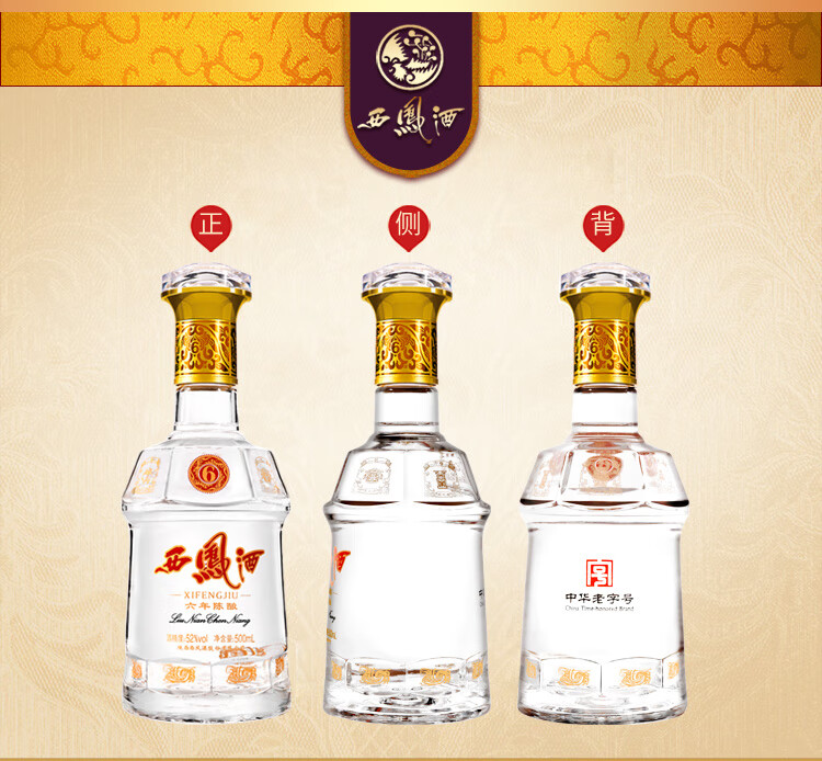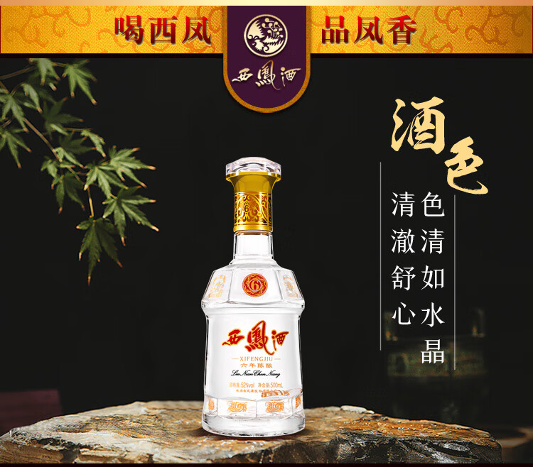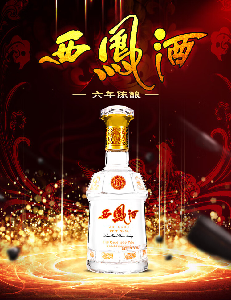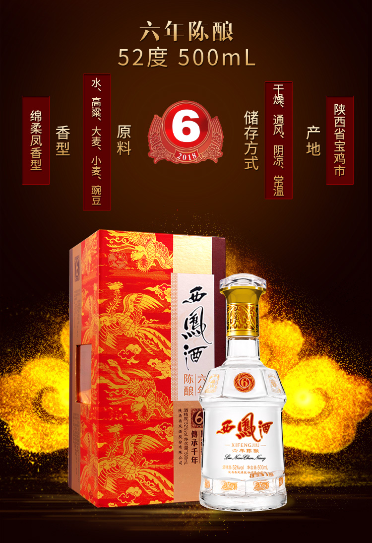 包装:整箱装;容量:500-749mL;香型:凤香型;产地:陕西;度数:50度及以上;酒精度:52%vol;容量:500ml;产品重量:1000g;包装清单:西凤酒 6年 六年陈酿 52度 500ml*6瓶 口感凤香型 整箱装白酒;