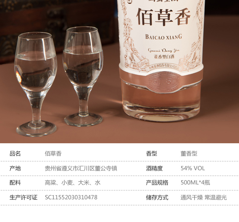 包装:整箱装;容量:500-749mL;香型:董香型;度数:50度及以上;产地:贵州;酒精度:54%vol;产品重量:9000g;容量:500ml;包装清单:董酒 董酒 白酒 佰草香 董香型 54度 500ml*4 整箱装*1;