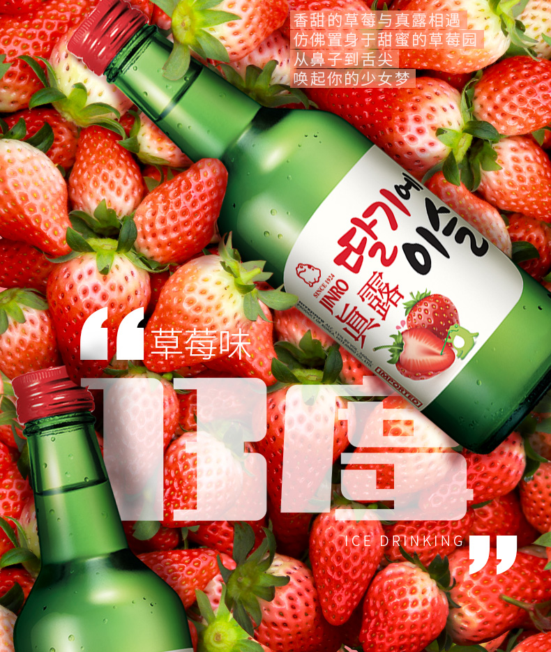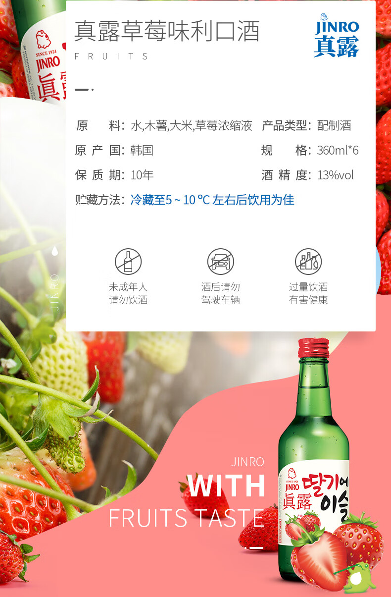 适用场景:自斟自饮,家庭聚会;包装:组合装;容量:1L及以上;国产/进口:进口;产地:韩国;原料:水、木薯、大米、浓缩草莓汁;保质期:3650;酒精度:13%vol;存储方法:放置于阴凉处;产品重量:3.92kg;包装清单:真露(JINRO)烧酒 韩国进口13°草莓味 360ml*6瓶 连包;