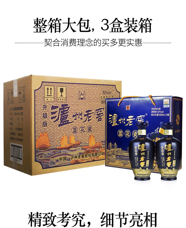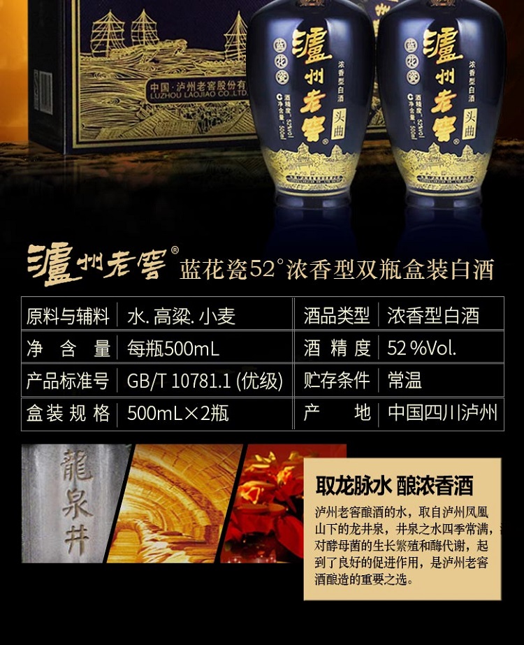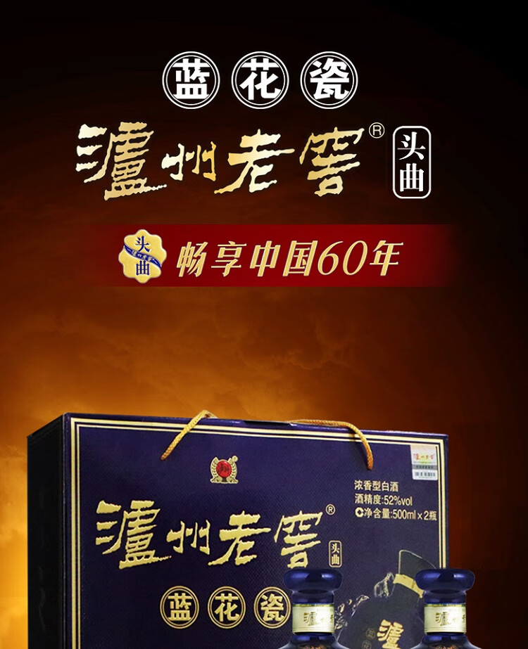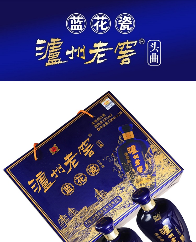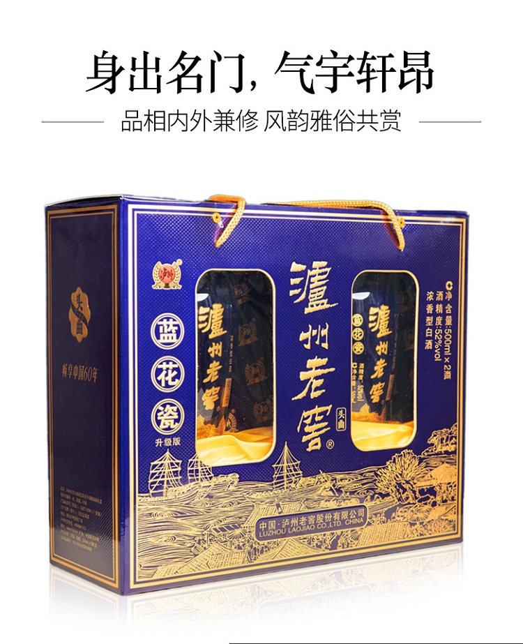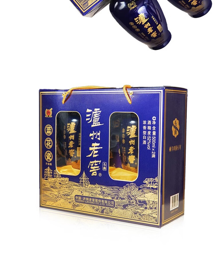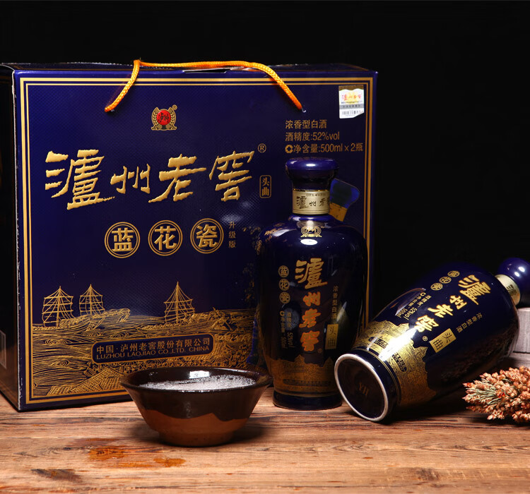 包装:礼盒装;容量:500-749mL;香型:浓香型;产地:四川;度数:50度及以上;酒精度:52%vol;容量:500ml*2;产品重量:2500g;包装清单:泸州老窖52度蓝花瓷双瓶礼盒500ml*2*1;