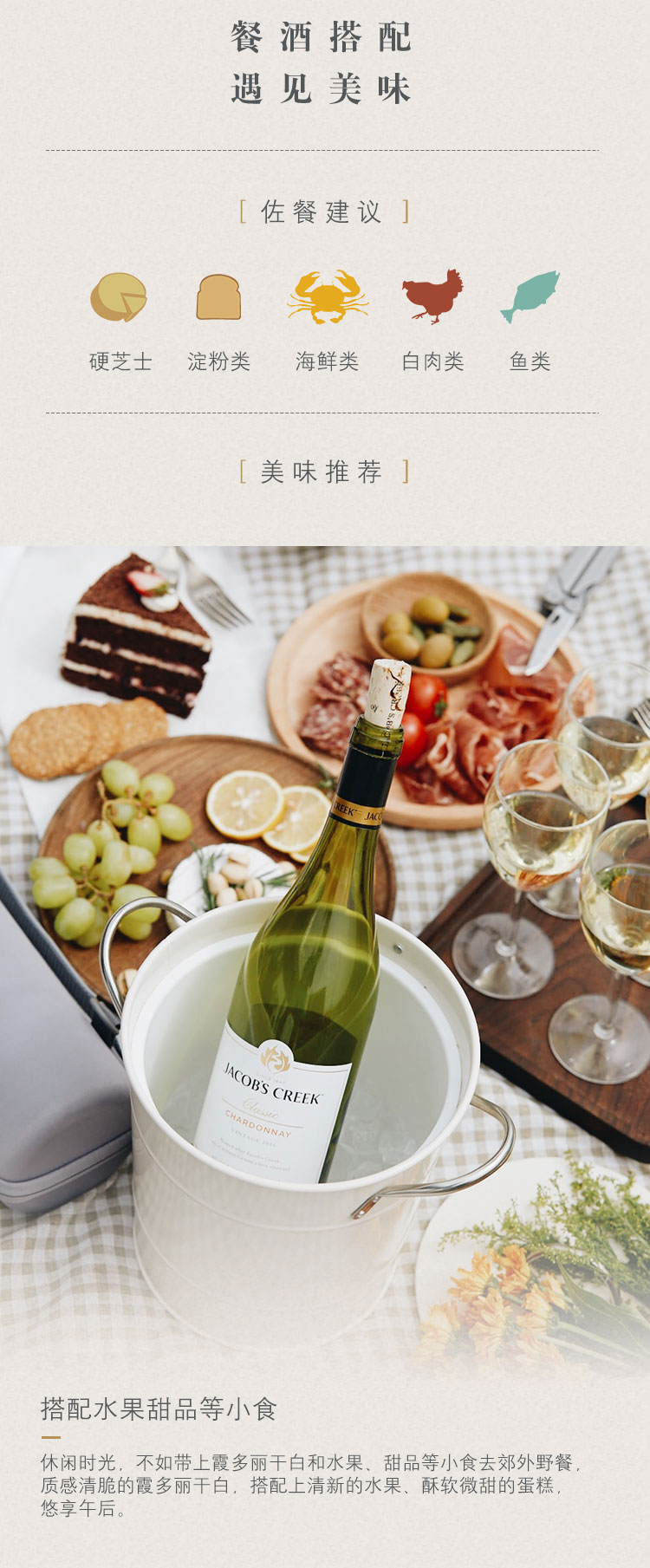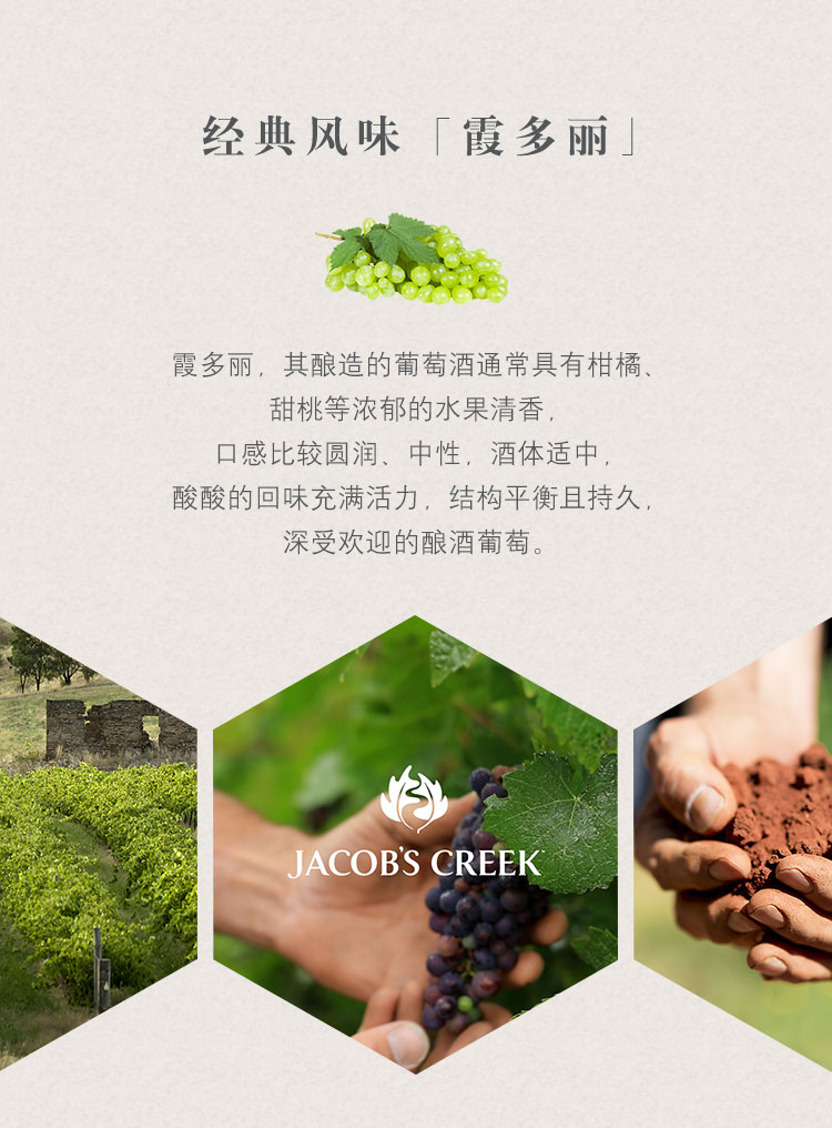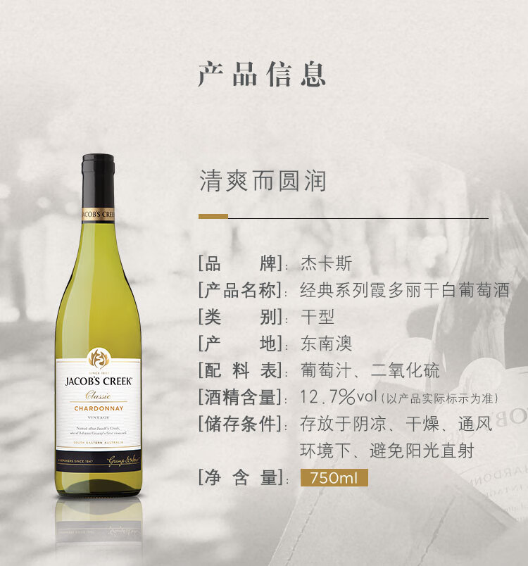 颜色:柠檬绿;口感:清新;特性:列级庄;国产/进口:进口;适用场景:家庭聚会,礼节拜访,商务宴请,婚礼婚宴,情侣约会,自斟自饮,闺蜜私语,派对活动;包装:瓶装;酸度:低酸;类别:白葡萄酒;葡萄品种:霞多丽(Chardonnay);类型:静止酒;香型:果香;产地:澳大利亚;容量:750mL;甜度:半干型;保质期:长期;酒精度:详见酒标;原产地:澳大利亚;存储方法:存放于阴凉、干燥、通风环境下。避免阳光直射;容量:750ml;产品重量:8kg;包装清单:杰卡斯(Jacob’s Creek) 经典霞多丽干白葡萄酒 750ml*6 整箱装 澳大利亚进口葡萄酒;