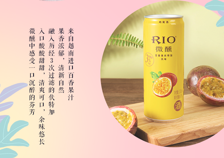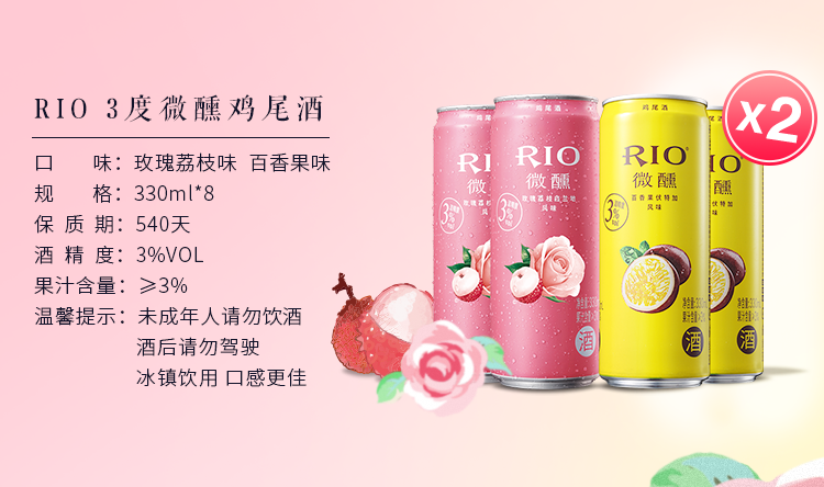 国产/进口:国产;产地:中国大陆;适用场景:商务宴请,家庭聚会,闺蜜私语,亲友馈赠,自斟自饮,情侣约会;包装:其它;容量:200-374mL;原料:水、白砂糖、果葡糖浆、食品添加剂、食用香精等;保质期:540天;酒精度:3%vol;存储方法:请置于阴凉干燥处,避免高温和阳光直晒,禁止加热或0℃以下冷冻,切勿撞击。;容量:330mL;产品重量:2.88kg;包装清单:锐澳(RIO)洋酒 预调鸡尾酒 微醺百香果330ml*4+玫瑰荔枝 330ml*4罐;