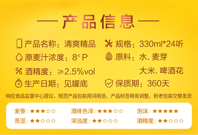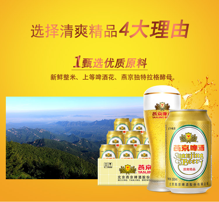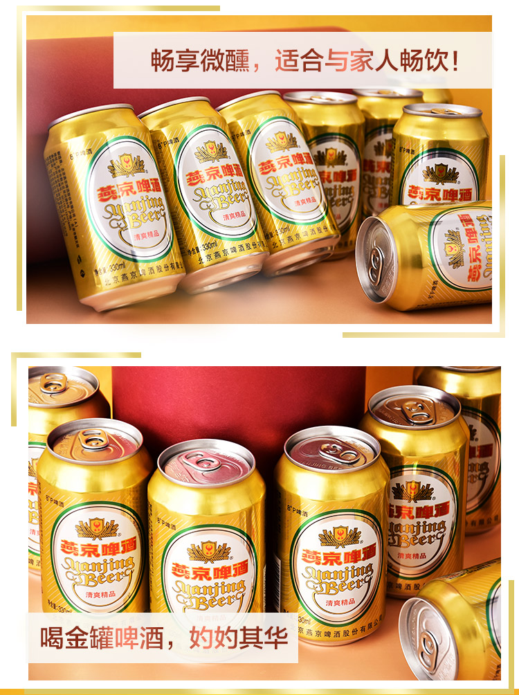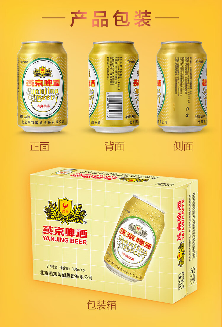 国产/进口:国产;产地:中国大陆;适用场景:野餐出游,礼节拜访,家庭聚会,自斟自饮,情侣约会,烧烤撸串,派对必备;包装:听装;容量:330mL;类别:黄啤酒;原料:水,麦芽,大米,啤酒花;保质期:360天;酒精度:≥2.5%vol;原产地:中国大陆;原麦汁浓度:8°P;存储方法:5℃-25℃, 避光贮运;容量:330ml;产品重量:8.6kg;包装清单:燕京啤酒 8度 清爽精品啤酒330ml*24听整箱装 金罐;
