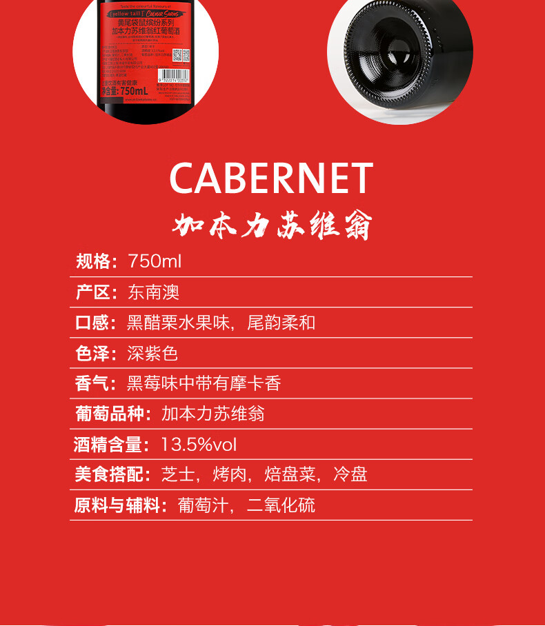 口感:饱满;特性:普通餐酒;国产/进口:进口;产地:澳大利亚;适用场景:家庭聚会,婚礼婚宴,情侣约会,自斟自饮,闺蜜私语,派对活动;包装:整箱装;容量:750mL;甜度:半干型;类别:红葡萄酒;葡萄品种:赤霞珠(Cabernet Sauvignon);系列:缤纷系列;保质期:长期;酒精度:13.5%vol;原产地:澳大利亚;存储方法:避光、常温贮藏;容量:750ml;产品重量:7.29kg;包装清单:黄尾袋鼠缤纷系列 加本力苏维翁红葡萄酒 750ml*6 整箱;