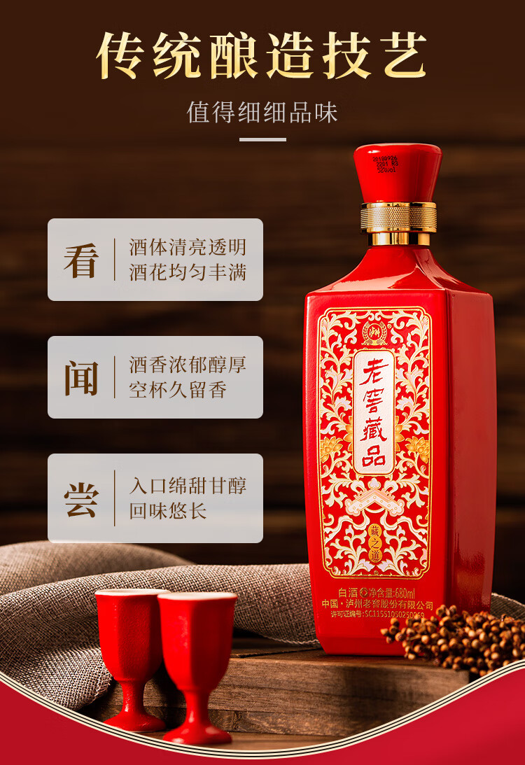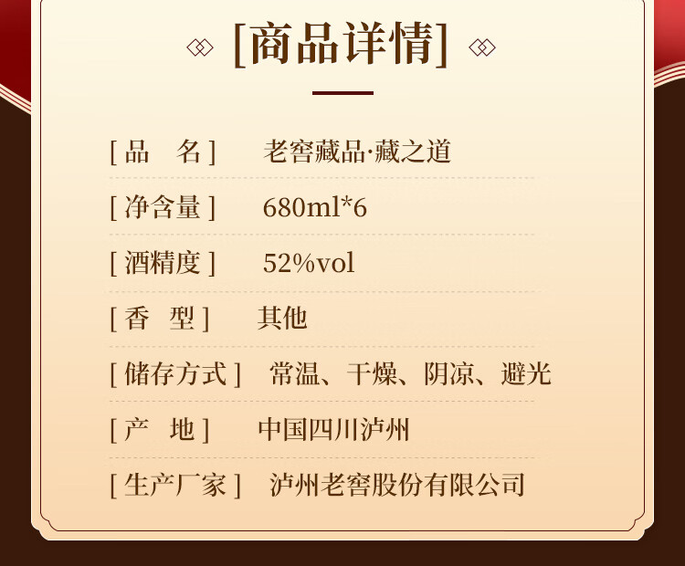 包装:整箱装;容量:500-749mL;香型:其它;产地:四川;度数:50度及以上;酒精度:52%vol;容量:680ml*6;产品重量:9810g;包装清单:藏之道 52度 680ml*6瓶;