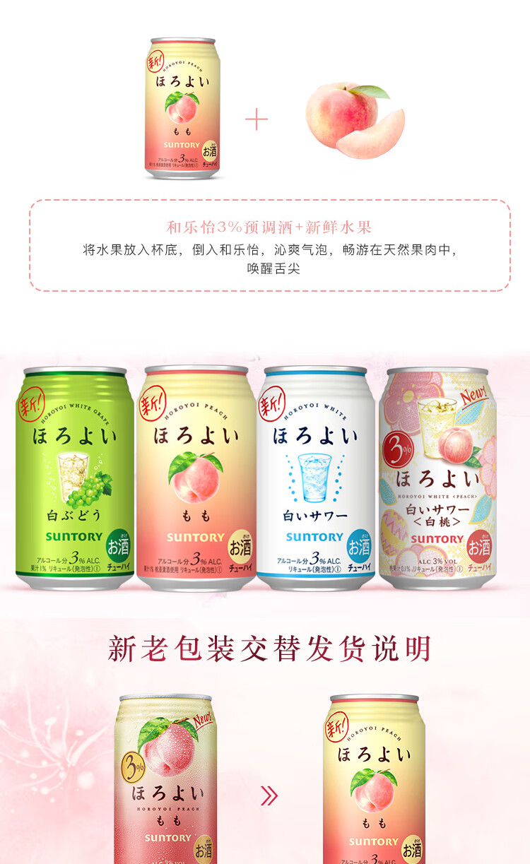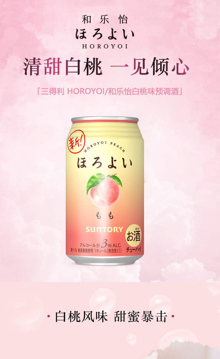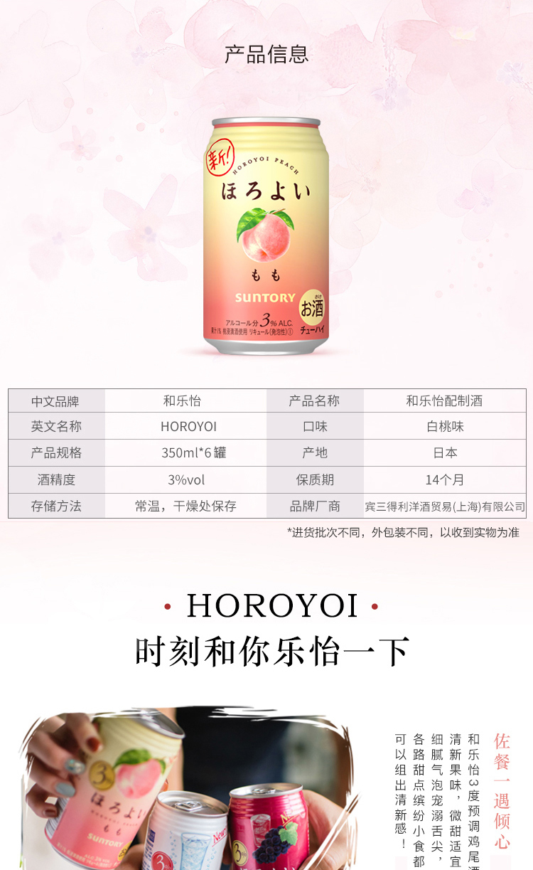 国产/进口:进口;产地:日本;适用场景:商务宴请,家庭聚会,闺蜜私语,亲友馈赠,自斟自饮,情侣约会;包装:组合装;容量:200-374mL;原料:汽水、果葡糖浆、食用酒精;保质期:420天;酒精度:3%vol;存储方法:请置于常温、干燥处保存;容量:350mL;产品重量:2.8kg;包装清单:和乐怡(HOROYOI) 三得利 日本进口 预调酒 鸡尾酒 果酒 白桃口味350ml*6罐*1;
