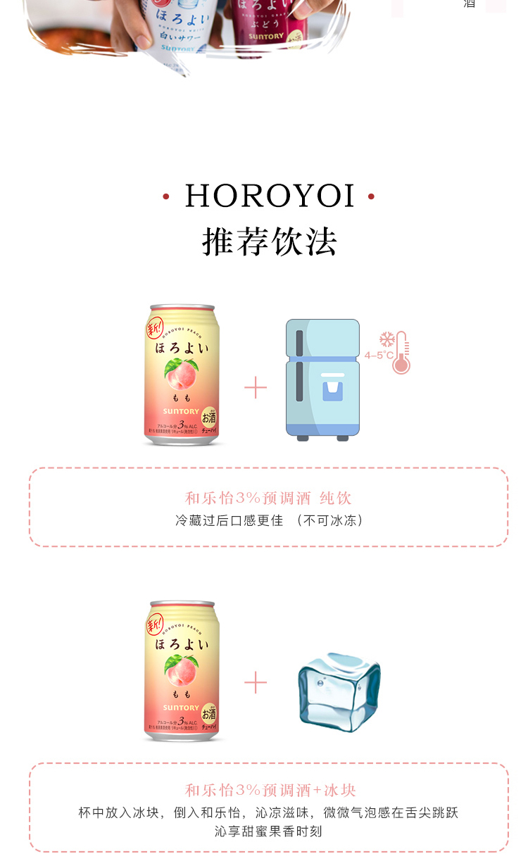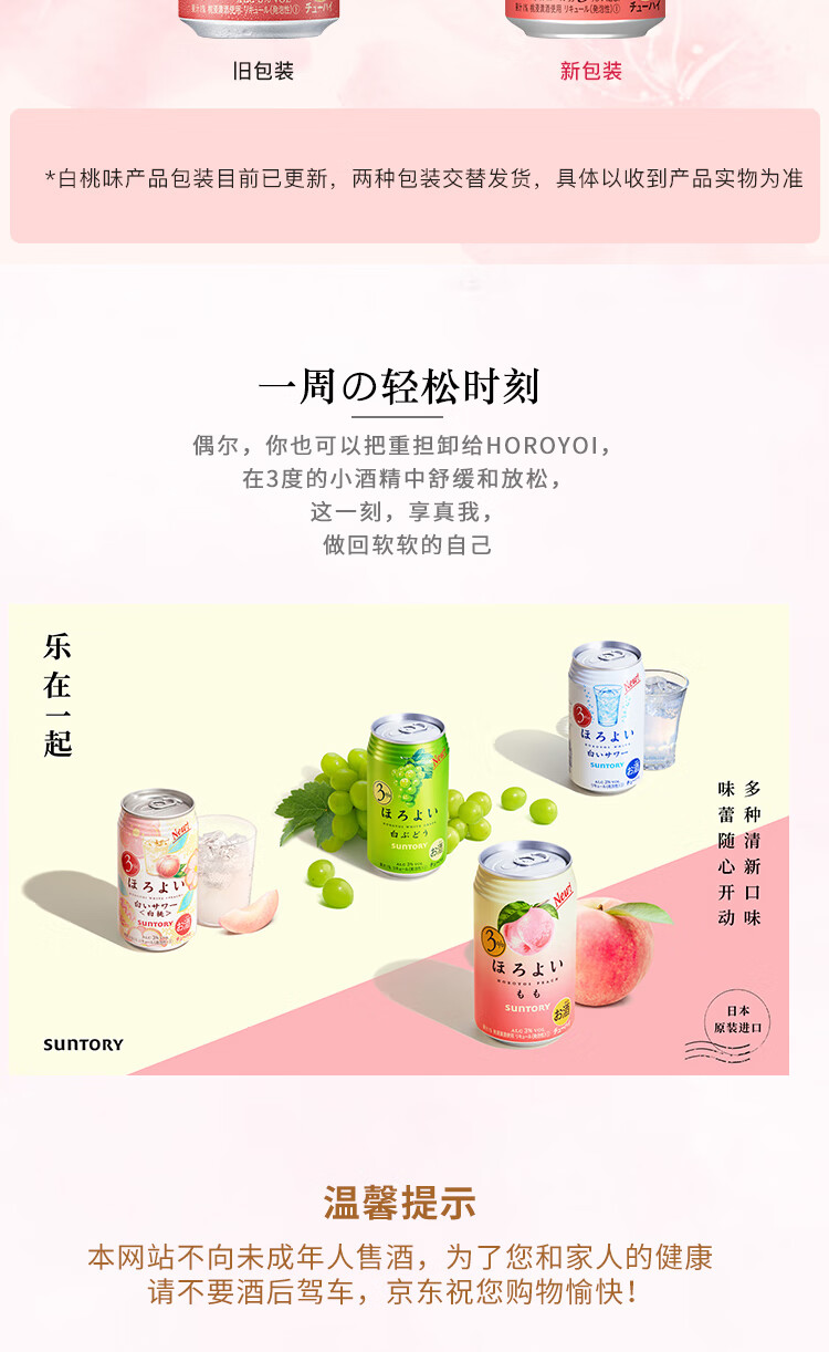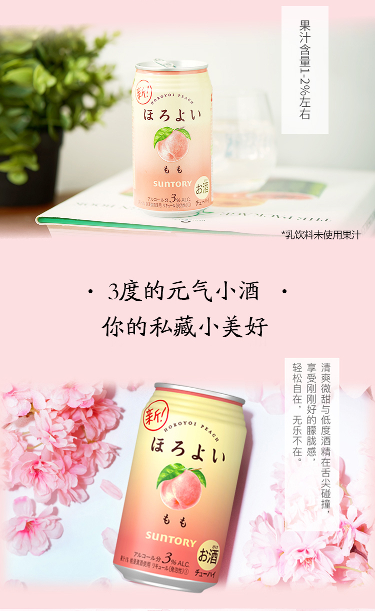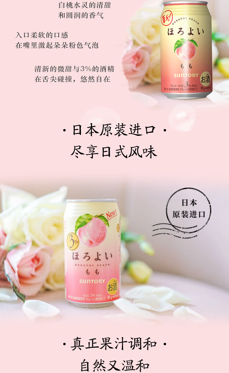 国产/进口:进口;产地:日本;适用场景:商务宴请,家庭聚会,闺蜜私语,亲友馈赠,自斟自饮,情侣约会;包装:组合装;容量:200-374mL;原料:汽水、果葡糖浆、食用酒精;保质期:420天;酒精度:3%vol;存储方法:请置于常温、干燥处保存;容量:350mL;产品重量:2.8kg;包装清单:和乐怡(HOROYOI) 三得利 日本进口 预调酒 鸡尾酒 果酒 白桃口味350ml*6罐*1;