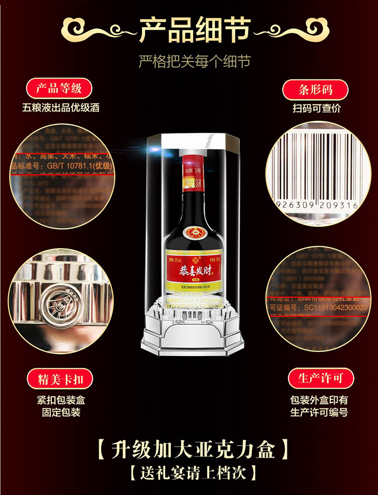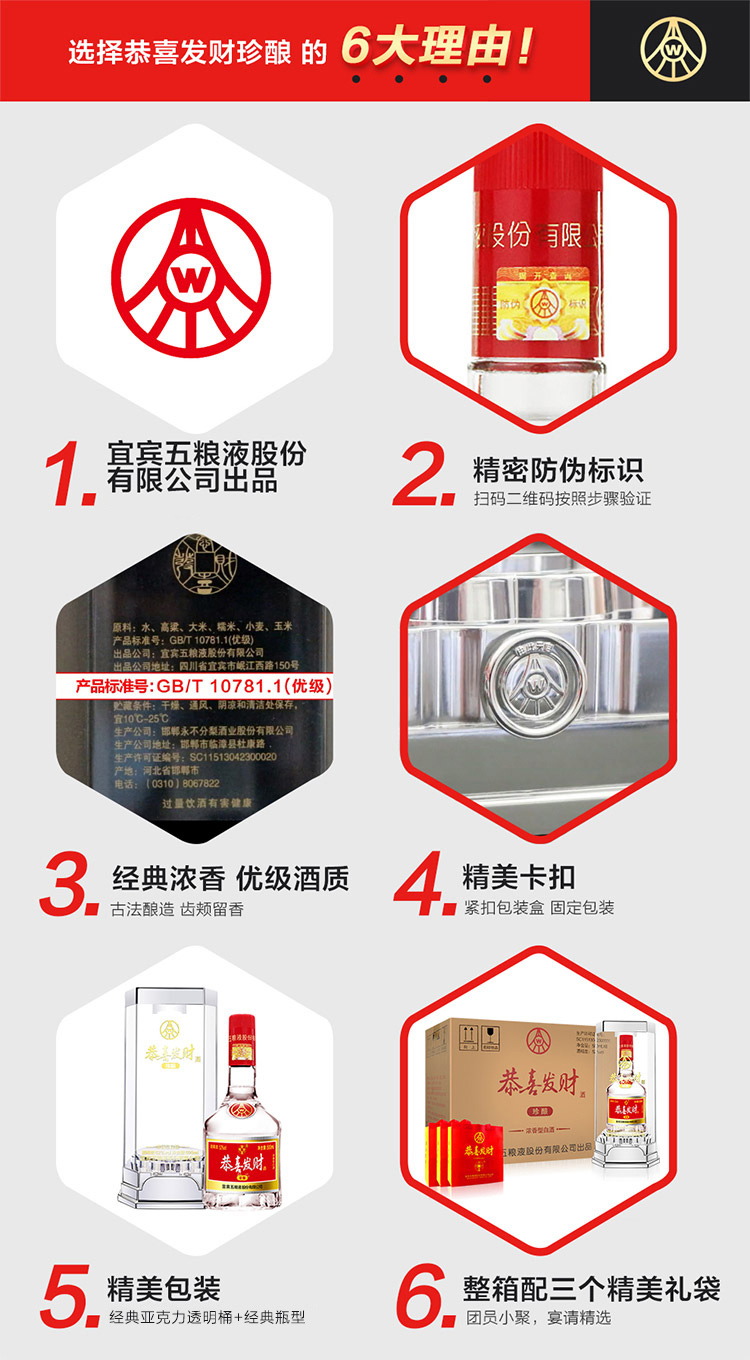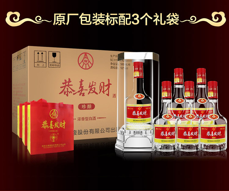 包装:整箱装;容量:500-749mL;香型:浓香型;产地:河北;度数:50度及以上;酒精度:52%vol;容量:500ml;产品重量:8977g;包装清单:恭喜发财珍酿52度500ml*6瓶 整箱装;