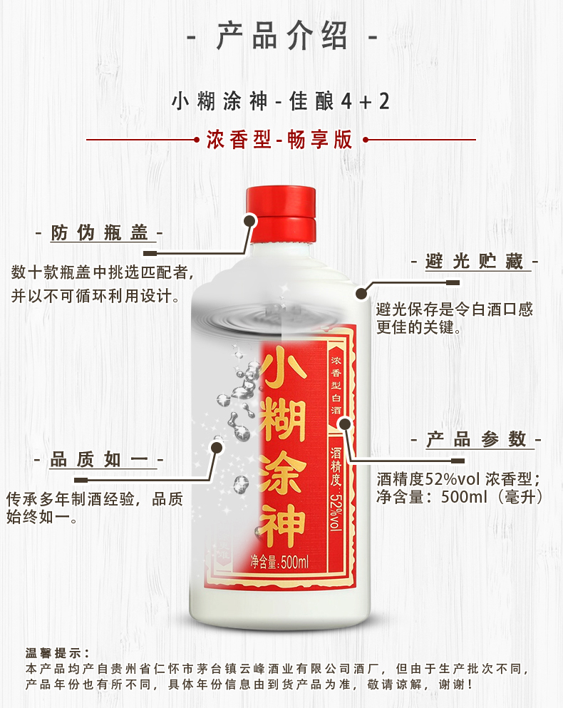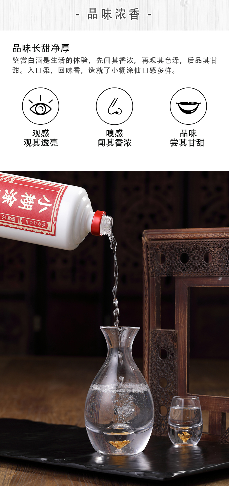 包装:整箱装;容量:500-749mL;香型:浓香型;产地:贵州;度数:50度及以上;酒精度:52%vol;容量:500;产品重量:6155g;包装清单:小糊涂仙 小糊涂神 佳酿4+2 52度 500ml*6瓶 整箱装;
