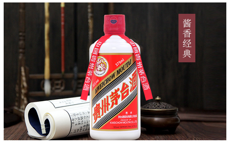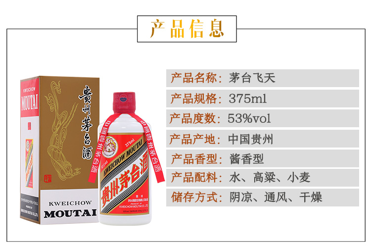 包装:瓶装;容量:375mL及以下;香型:酱香型;产地:贵州;度数:50度及以上;酒精度:53%vol;容量:375ml;产品重量:375g;包装清单:茅台 飞天 53度 375ml 单瓶装 酱香型白酒*1;