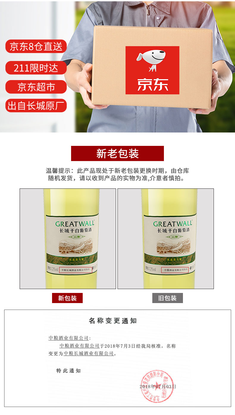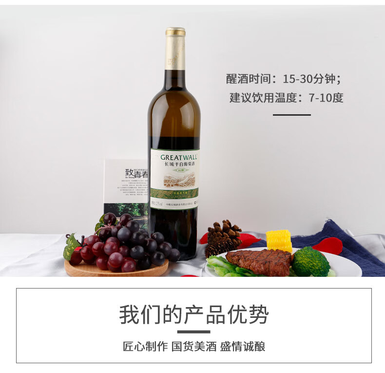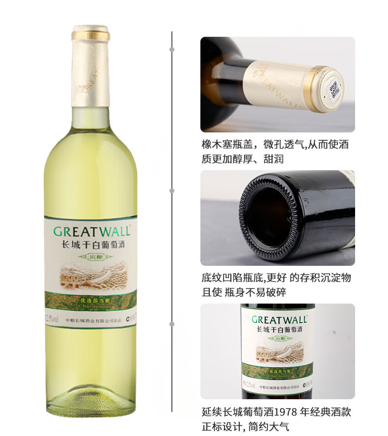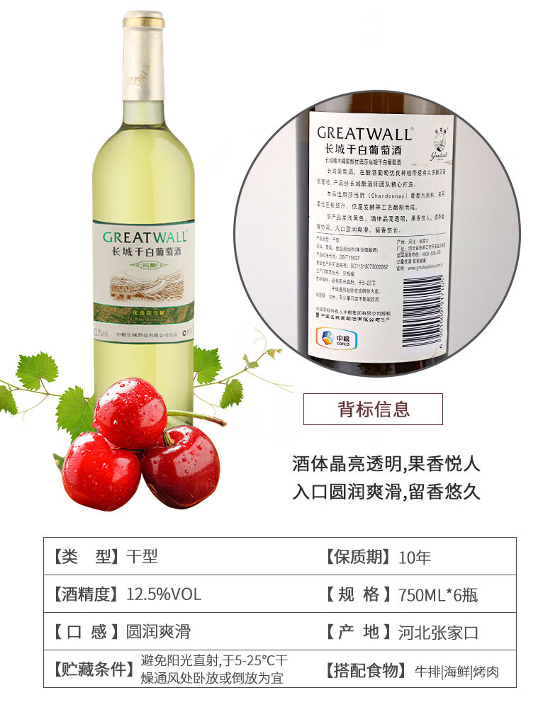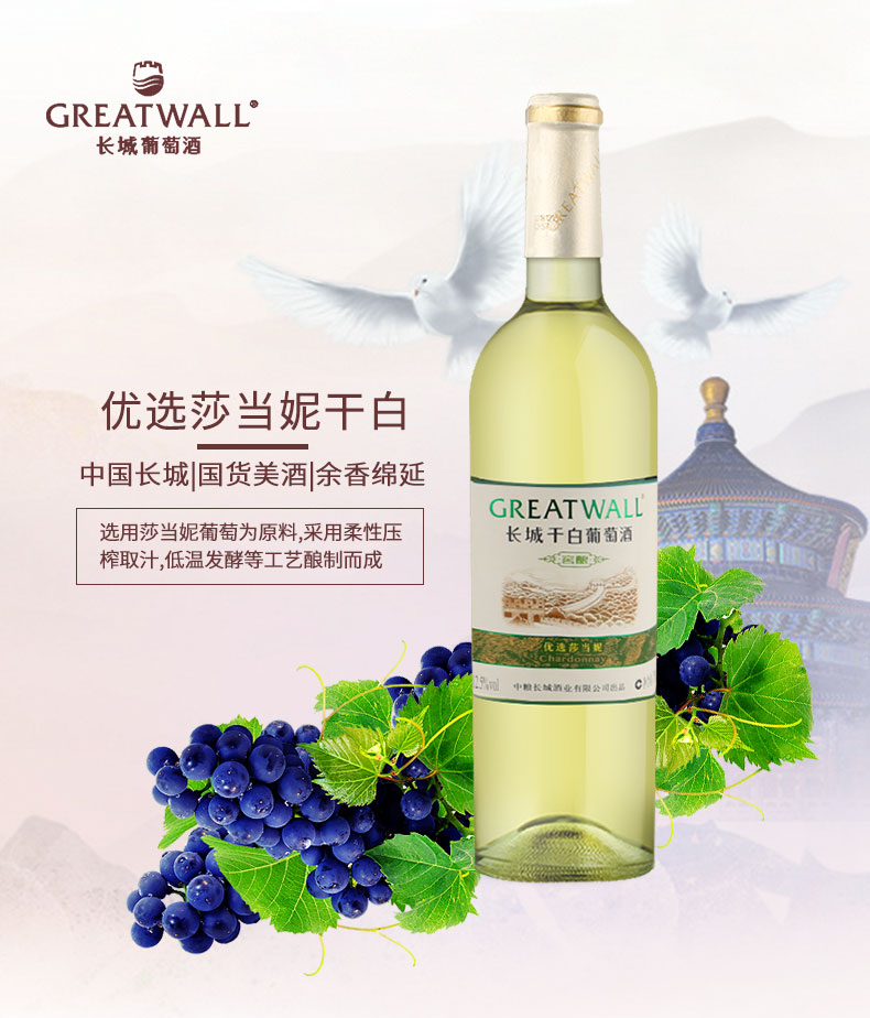 长城(GreatWall)红酒 橡木桶优选莎当妮干白葡萄酒750ML*6瓶整箱装