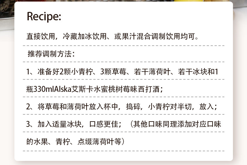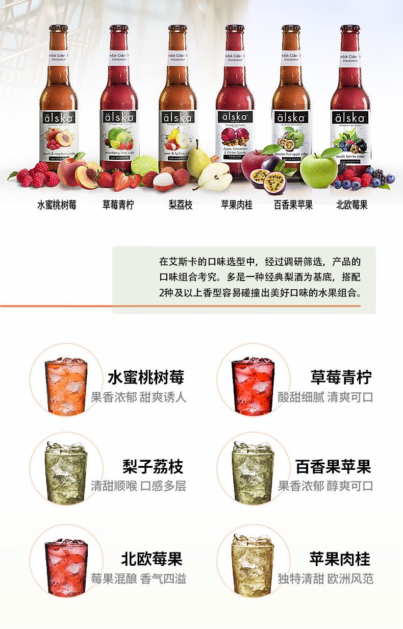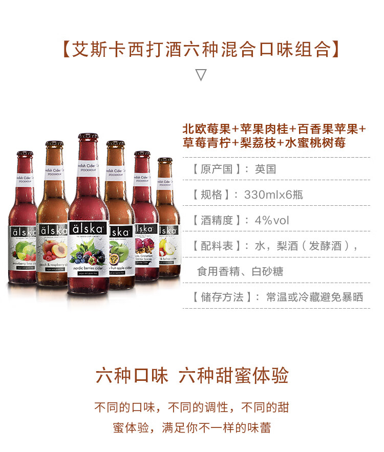 国产/进口:进口;产地:英国;适用场景:家庭聚会,礼节拜访,情侣约会,自斟自饮,派对必备,烧烤撸串,酒吧夜店,野餐出游;包装:礼盒装;容量:330mL;类别:无醇/果啤;原料:水,梨酒(发酵酒)(梨汁,二氧化硫)36.3%,白砂糖,二氧化碳食用香精;系列:混合口味;保质期:720天;酒精度:4%;原产地:英国;原麦汁浓度:N/A;存储方法:常温或冷藏避免暴晒;容量:330ml;产品重量:3.55kg;包装清单:草莓青柠+梨荔枝+水蜜桃树莓+北欧莓果+苹果肉桂+苹果百香果 共6瓶;