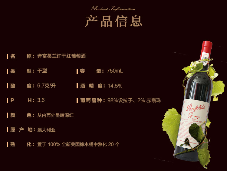 口感:饱满;特性:名庄葡萄酒;国产/进口:进口;适用场景:家庭聚会,礼节拜访,商务宴请,婚礼婚宴,情侣约会,自斟自饮,闺蜜私语,派对活动,收藏;包装:瓶装;类别:红葡萄酒;葡萄品种:西拉/设拉子(Syrah/Shiraz);产地:澳大利亚;容量:750mL;甜度:干型;特性:名庄葡萄酒;年份:2014;甜度:干型;颜色:砖红色;国产/进口:进口;葡萄品种:西拉/设拉子(Syrah/Shiraz);保质期:3650;酒精度:14.5%vol;原产地:澳大利亚;存储方法:避光、阴凉处卧放或倒置保存;口感:饱满;产区:南澳;类别:红葡萄酒;包装:瓶装;产品重量:0.75kg;容量:750Ml;包装清单:奔富(Penfolds)葛兰许BIN95设拉子红葡萄酒750ml*1;
